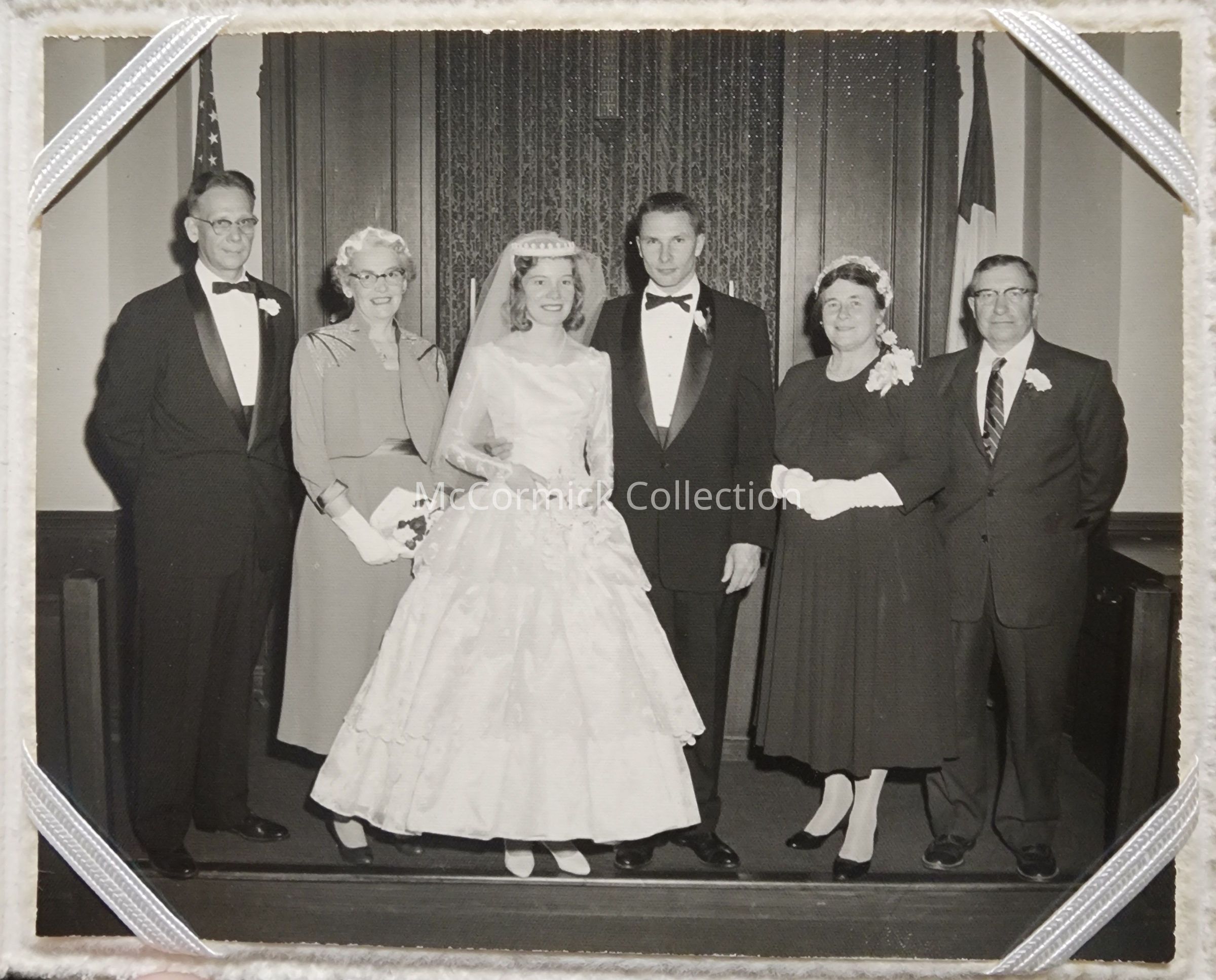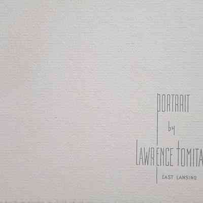 Folder frame mounted photograph of an unidentified couple and parents at a wedding by East Lansing photographer Lawrence Tomita.