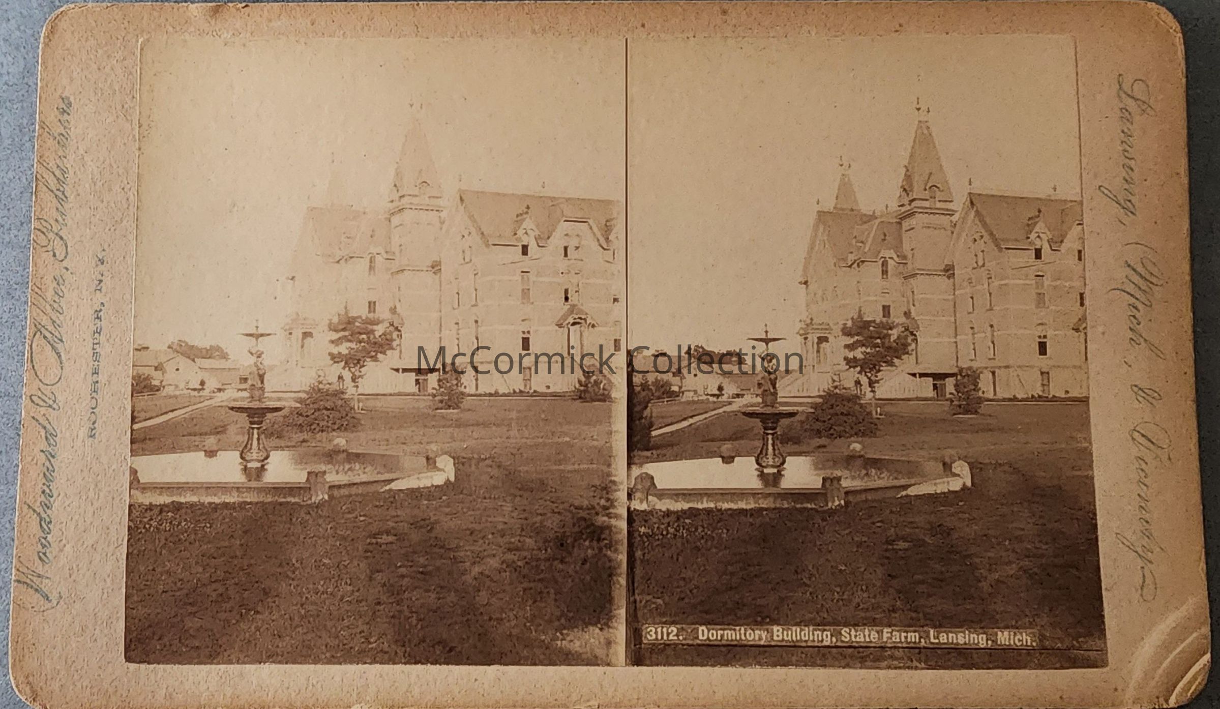 Stereograph of the first Wells Hall at Michigan Agricultural College, labeled "Dormitory Building, State Farm, Lansing, Mich." Numbered 3112.