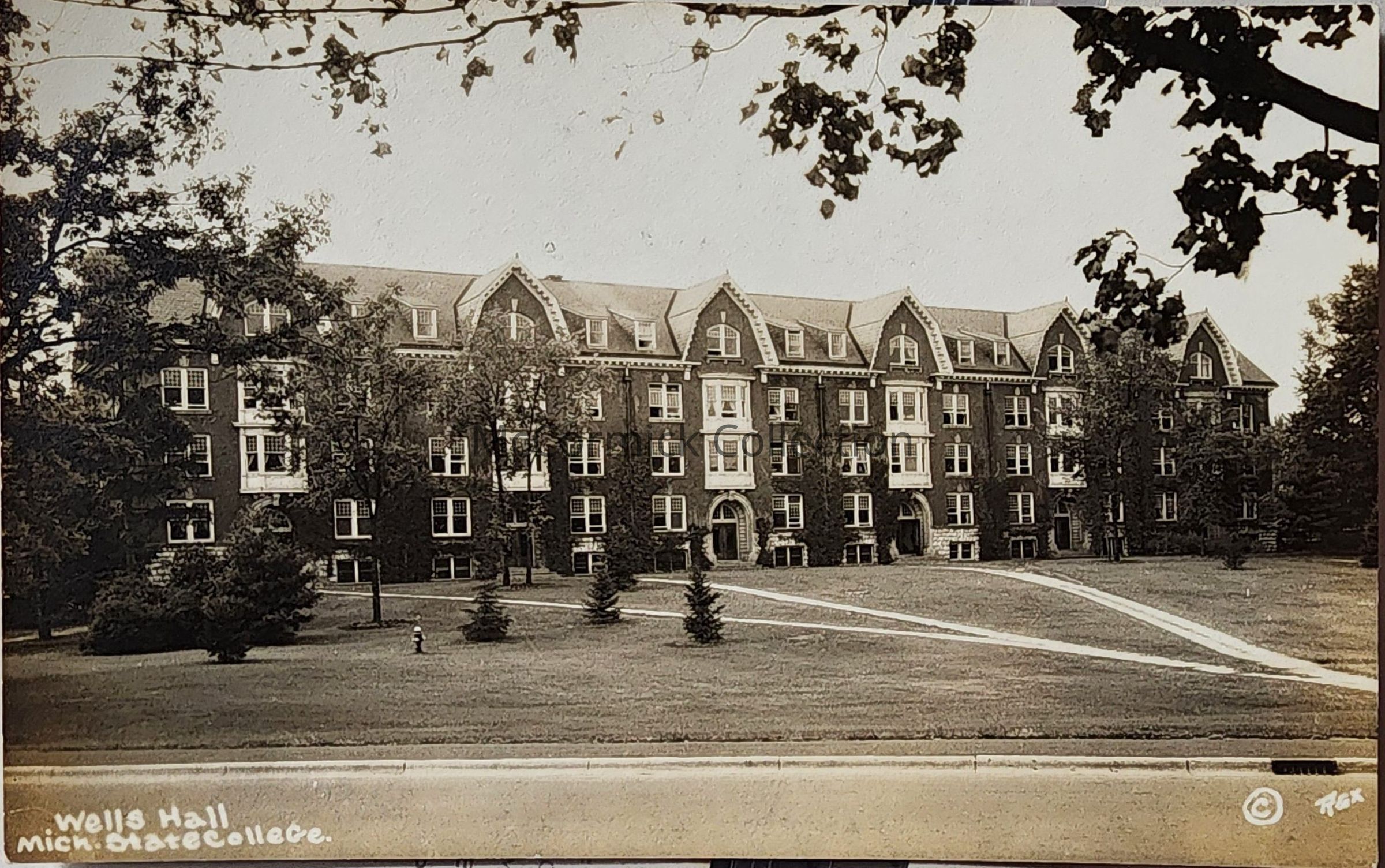 Real photo postcard of Wells Hall at Michigan State College by East Lansing photographer Rex.