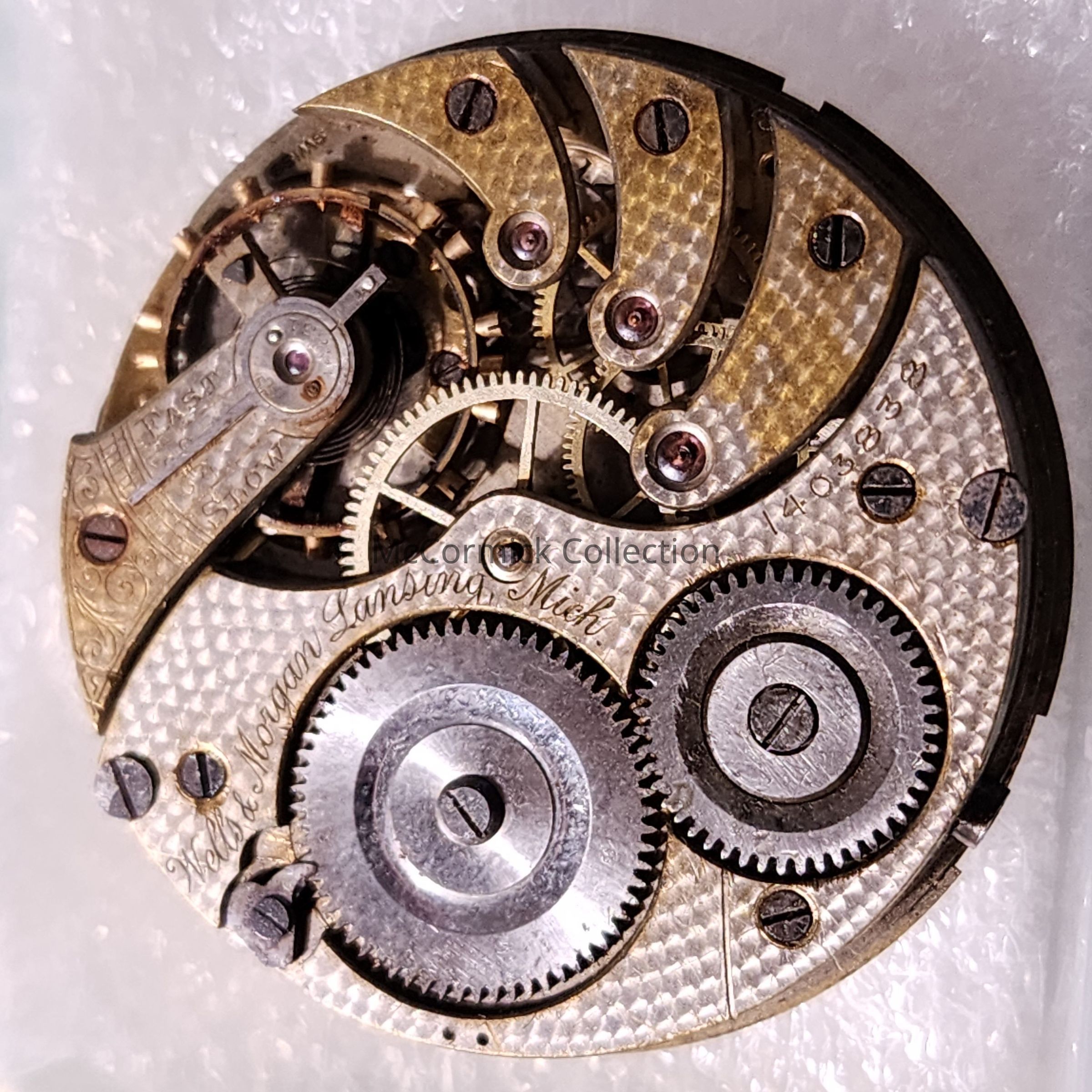 A pocket watch body without case made by Wells and Morgan of Lansing, Michigan.