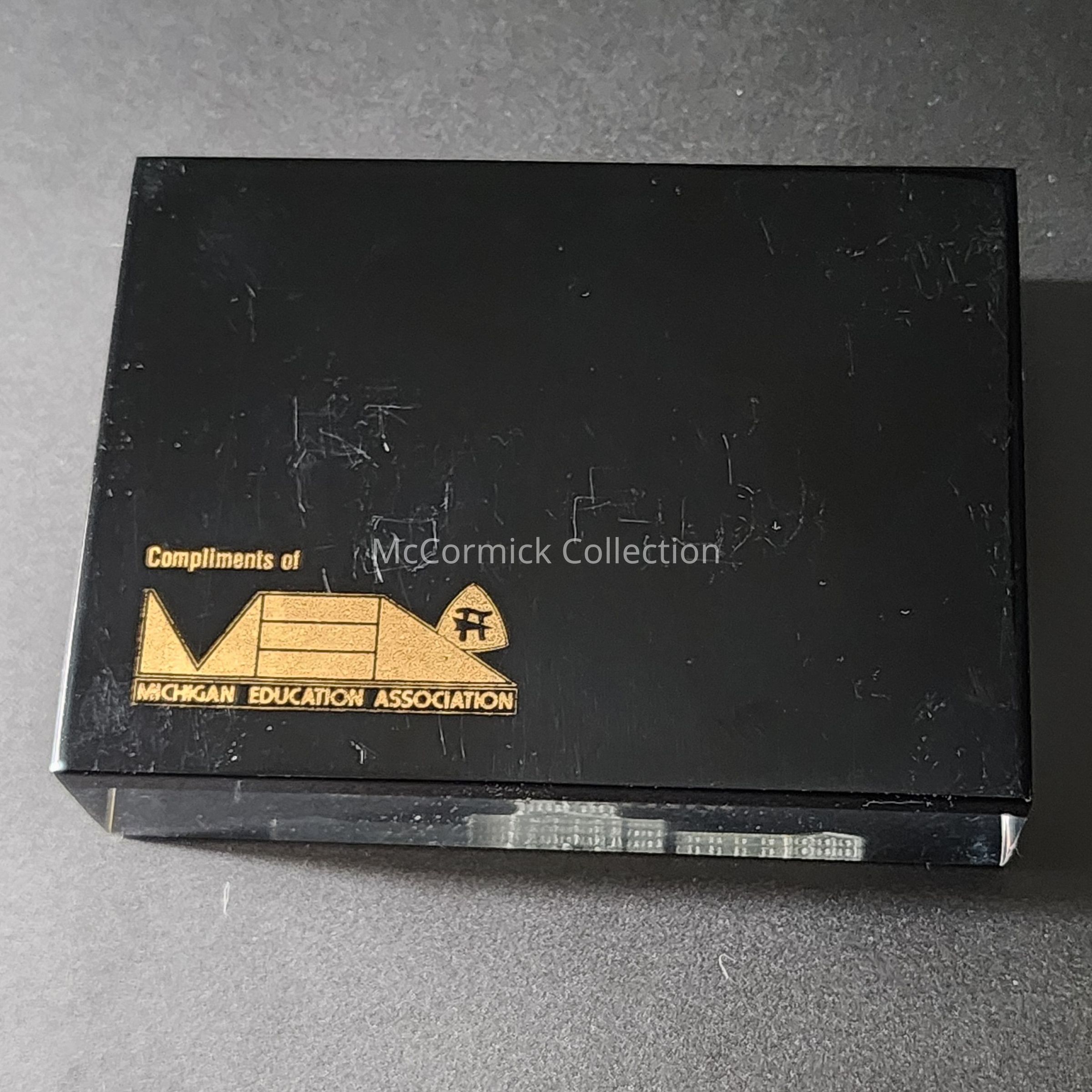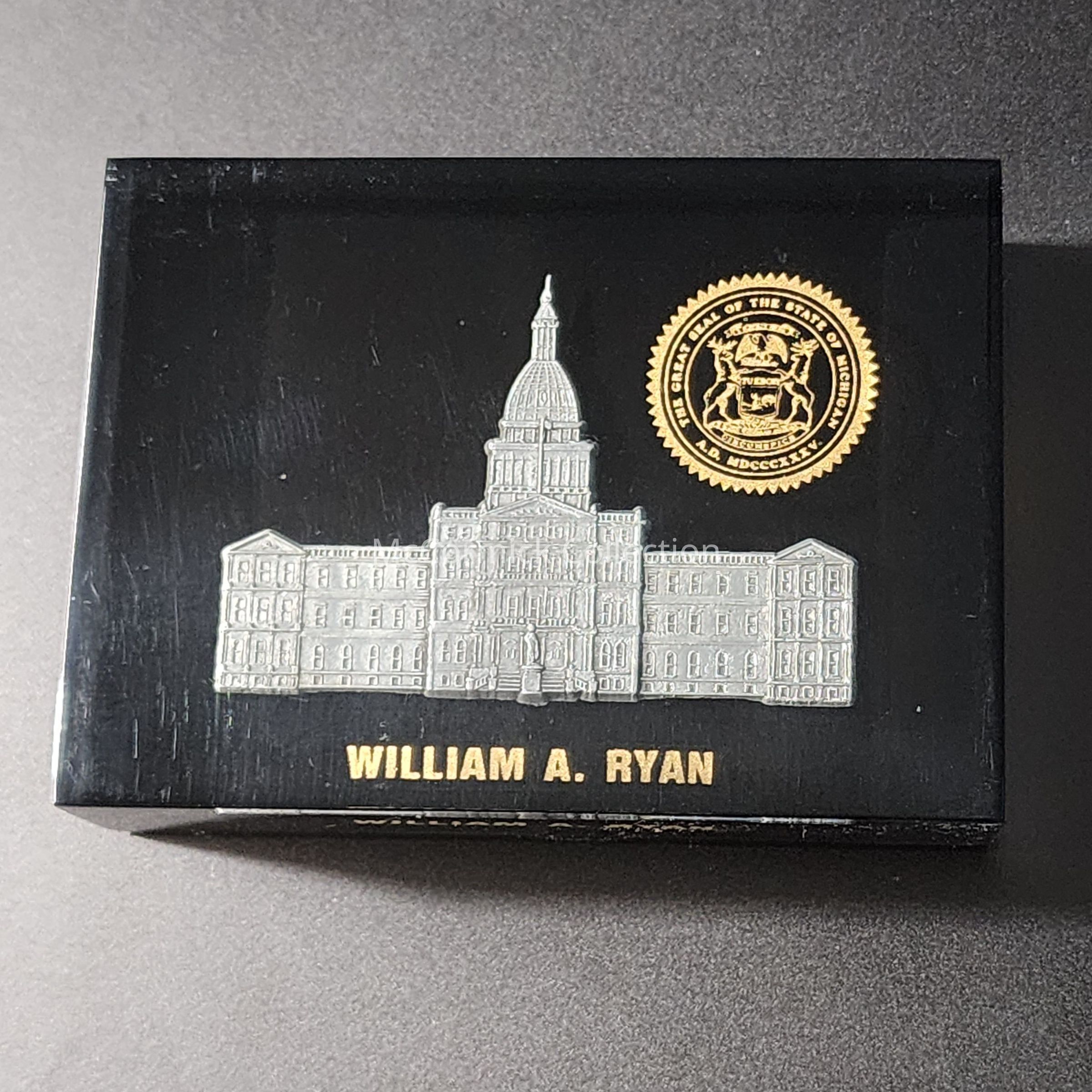 Michigan State Capitol acrylic paperweight belonging to House Speaker William A. Ryan, gift of the Michigan Education Association (MEA).