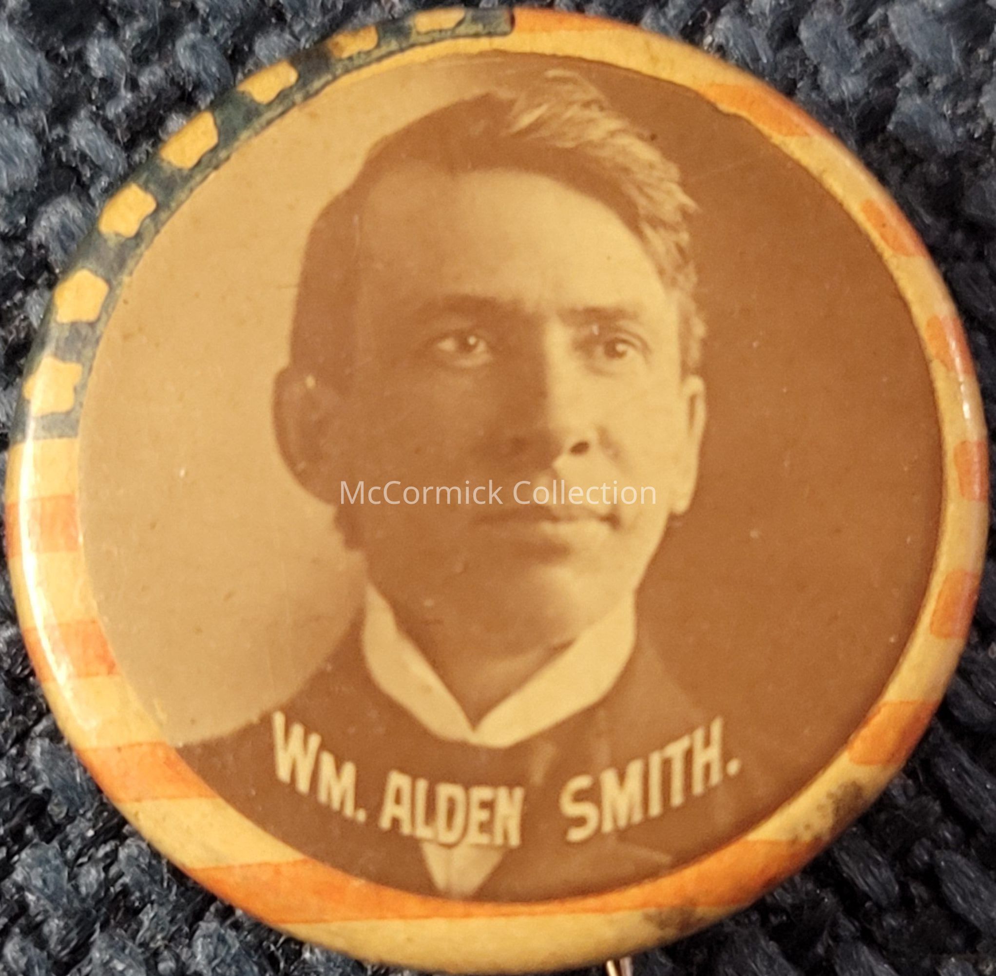 Political picture button, 3/4", for William Alden Smith for U.S. Senate. Flag motif around border. Circa 1910s. Senator Smith chaired the Senate investigation into the Titanic sinking.