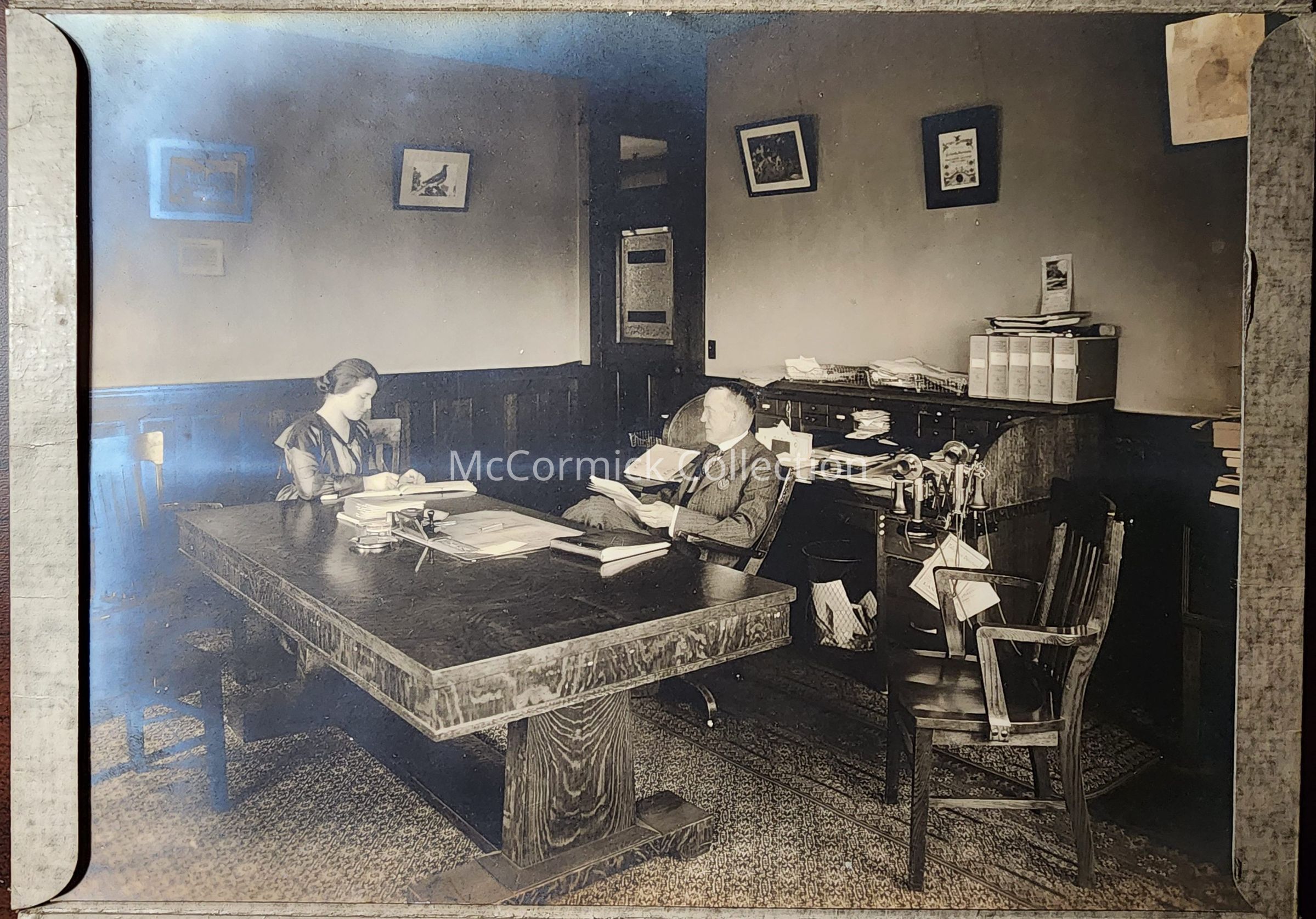 Photograph of William Newbrough in his office with a secretary taking dictation. Newbrough was president and general manager of New Way Motor Co., March 1918.