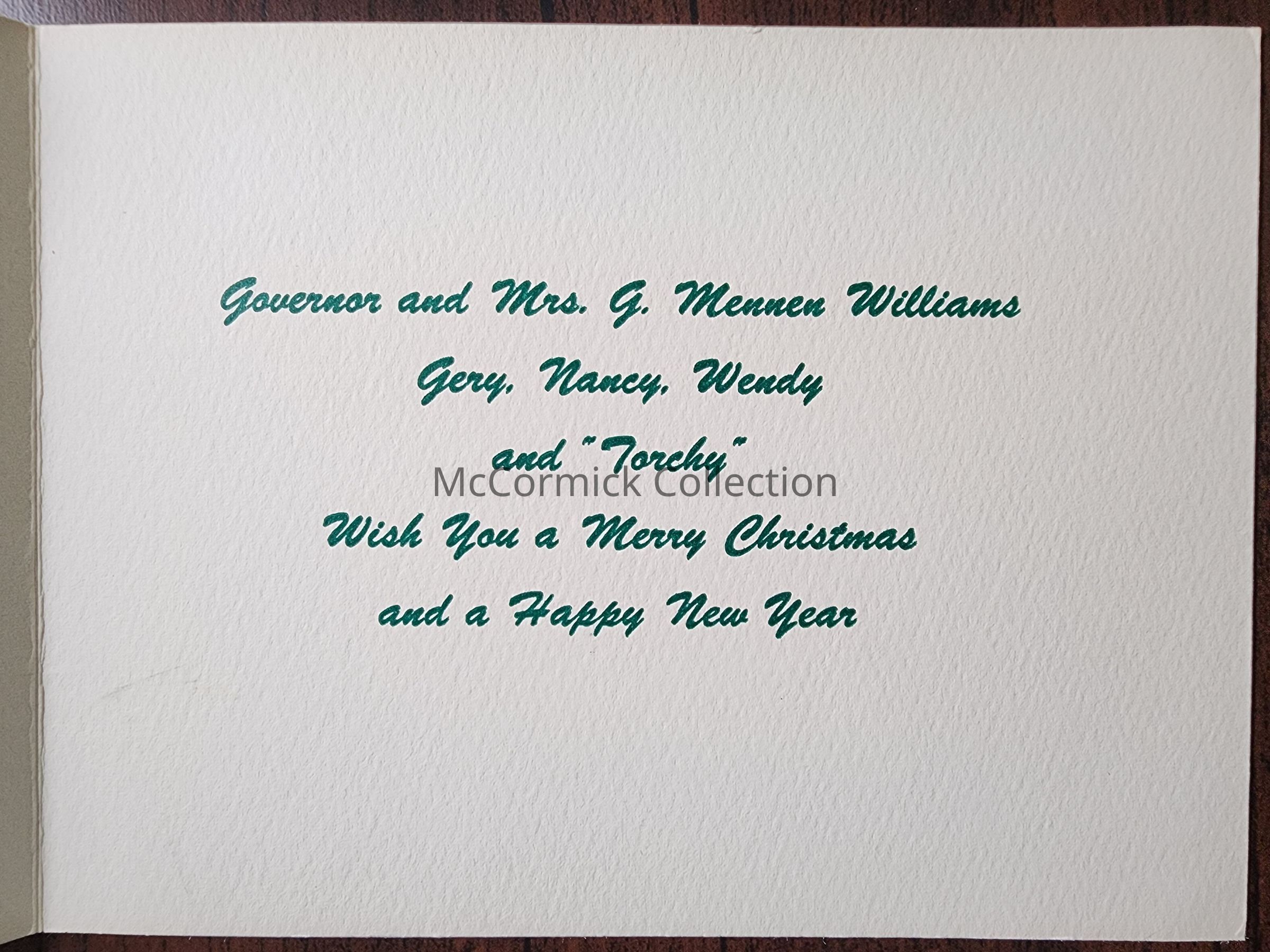 Christmas card from the family of Michigan governor G. Mennen Williams, circa 1950s. Not dated.