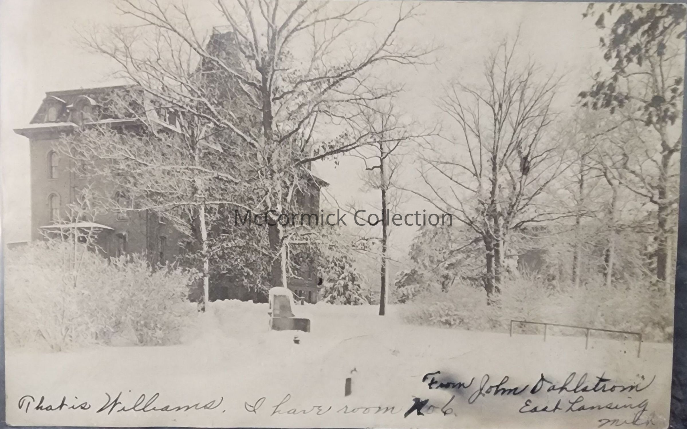 Real photo postcard of Williams Hall at Michigan Agricultural College, postmarked 1908.