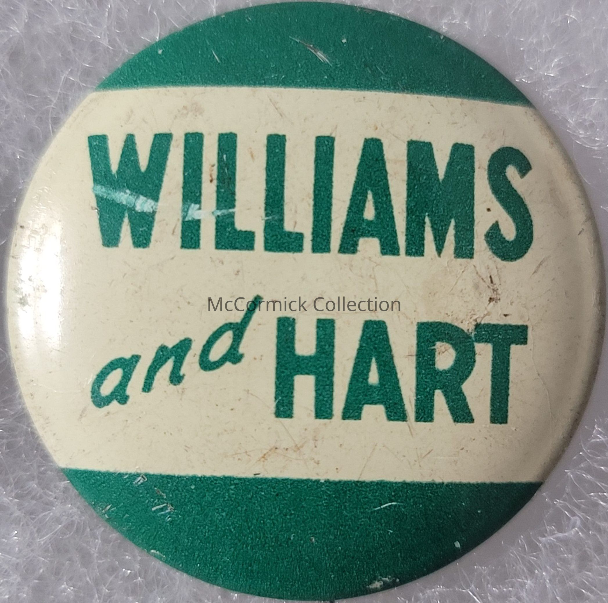 A 1" green and white political coattail button for G. Mennen Williams for Governor and Philip A. Hart for Lt. Governor, circa 1950s.