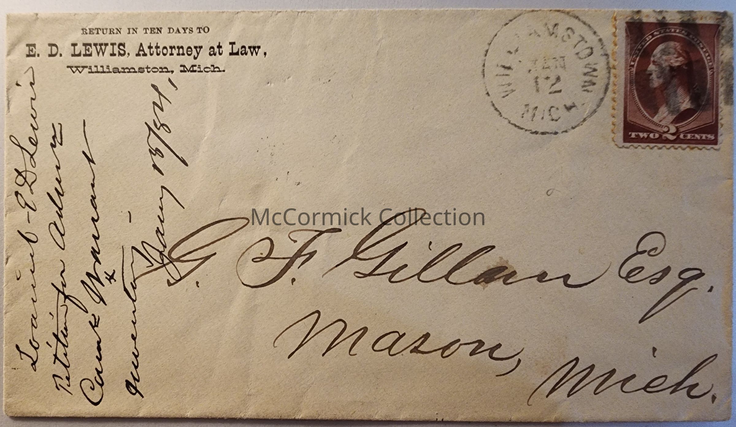 E.D. Lewis, Attorney at Law, Williamston, Michigan. Addressed to Mason.