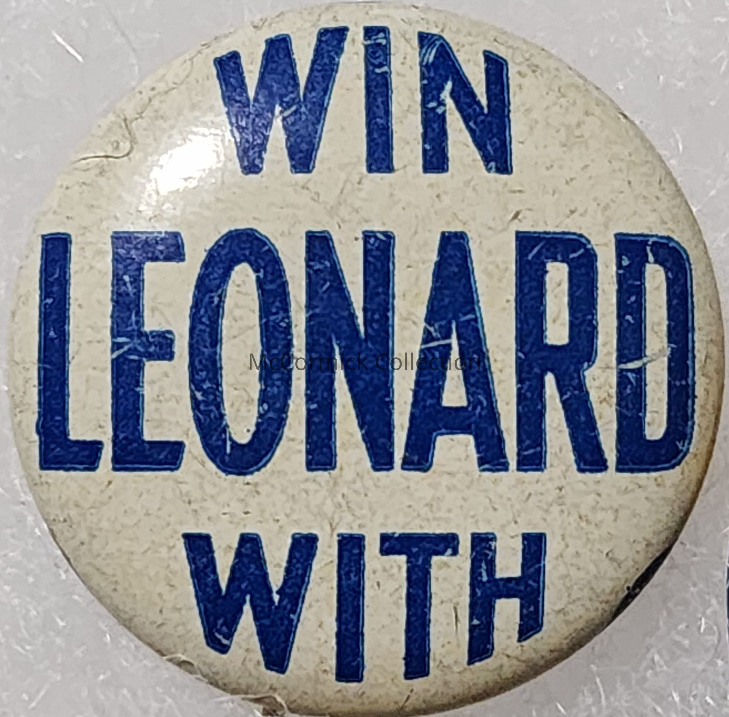 A 6/8" Blue and white political button for Don Leonard for Governor, 1950s.