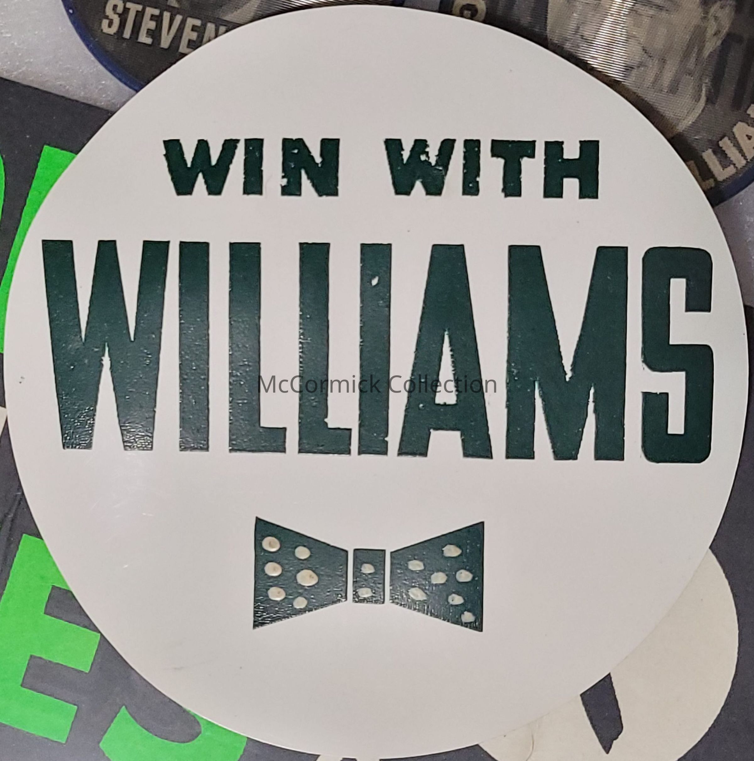 Large 4" plastic pinback for G. Mennen Williams political campaigns. Includes his bowtie theme and reads "Win With Williams." Circa 1950s.