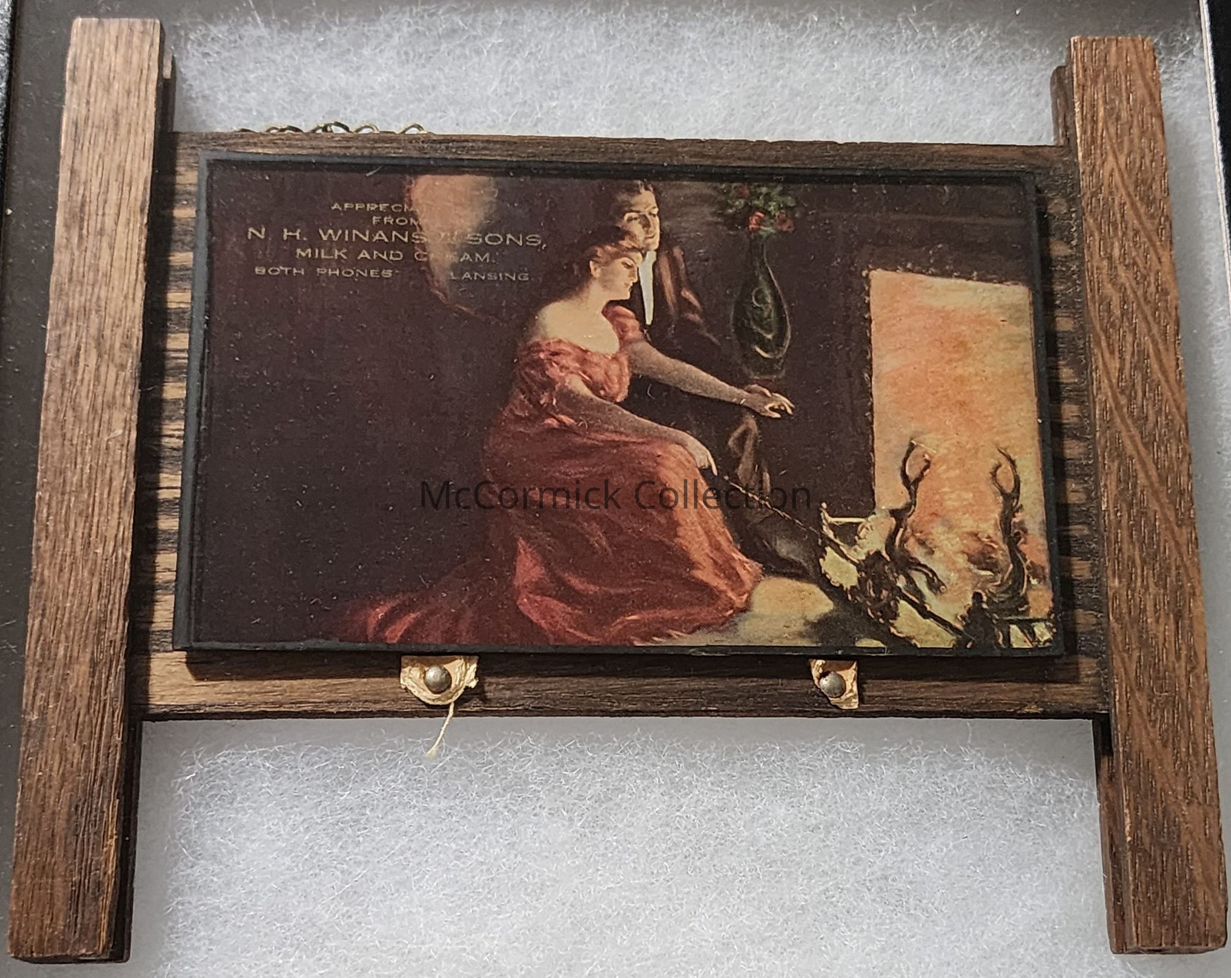 A wood and glass calendar holder, missing the calendar, from the Winans Dairy of Lansing.