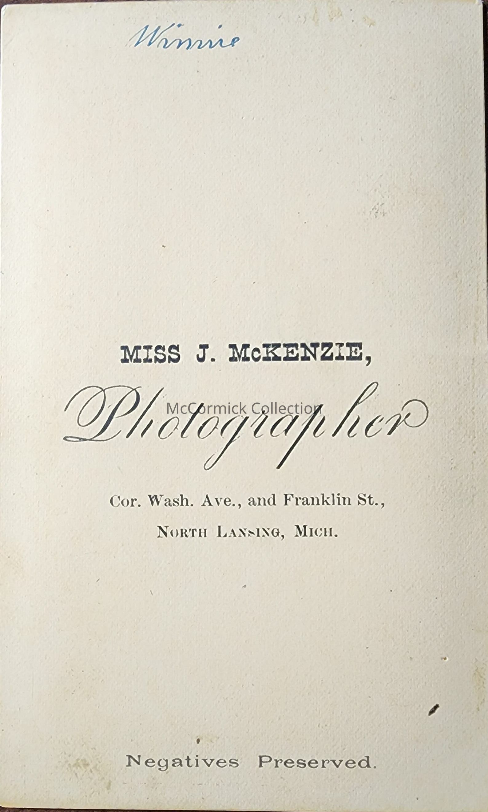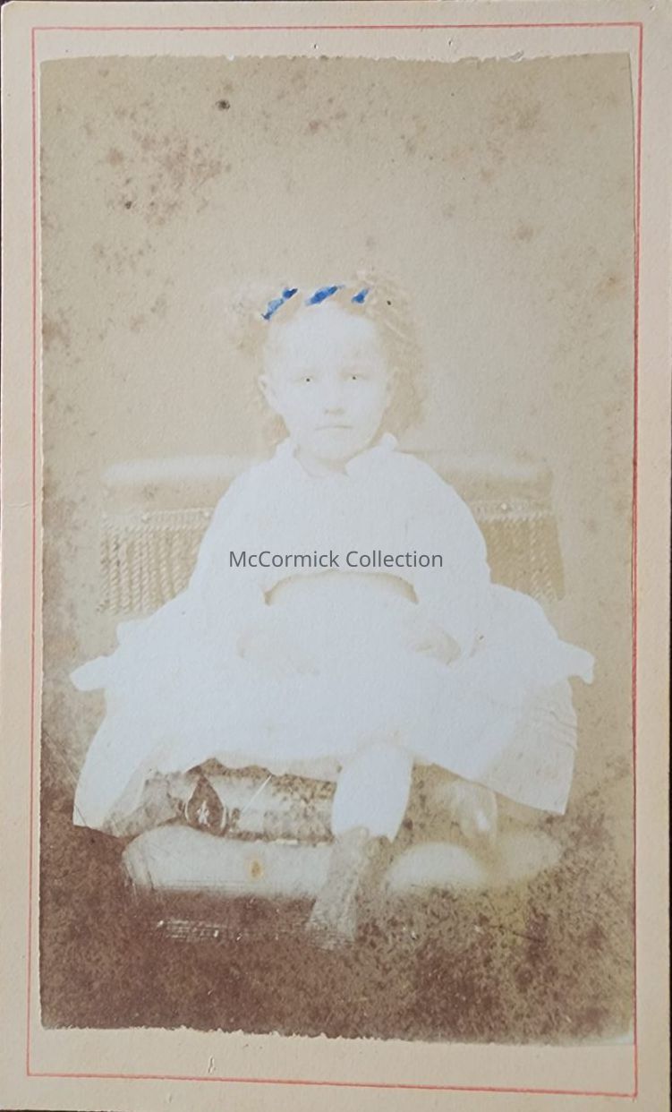 Carte de visite photograph of an unidentified child named Winnie by Lansing photographer Miss J. McKenzie. Hand tinted.