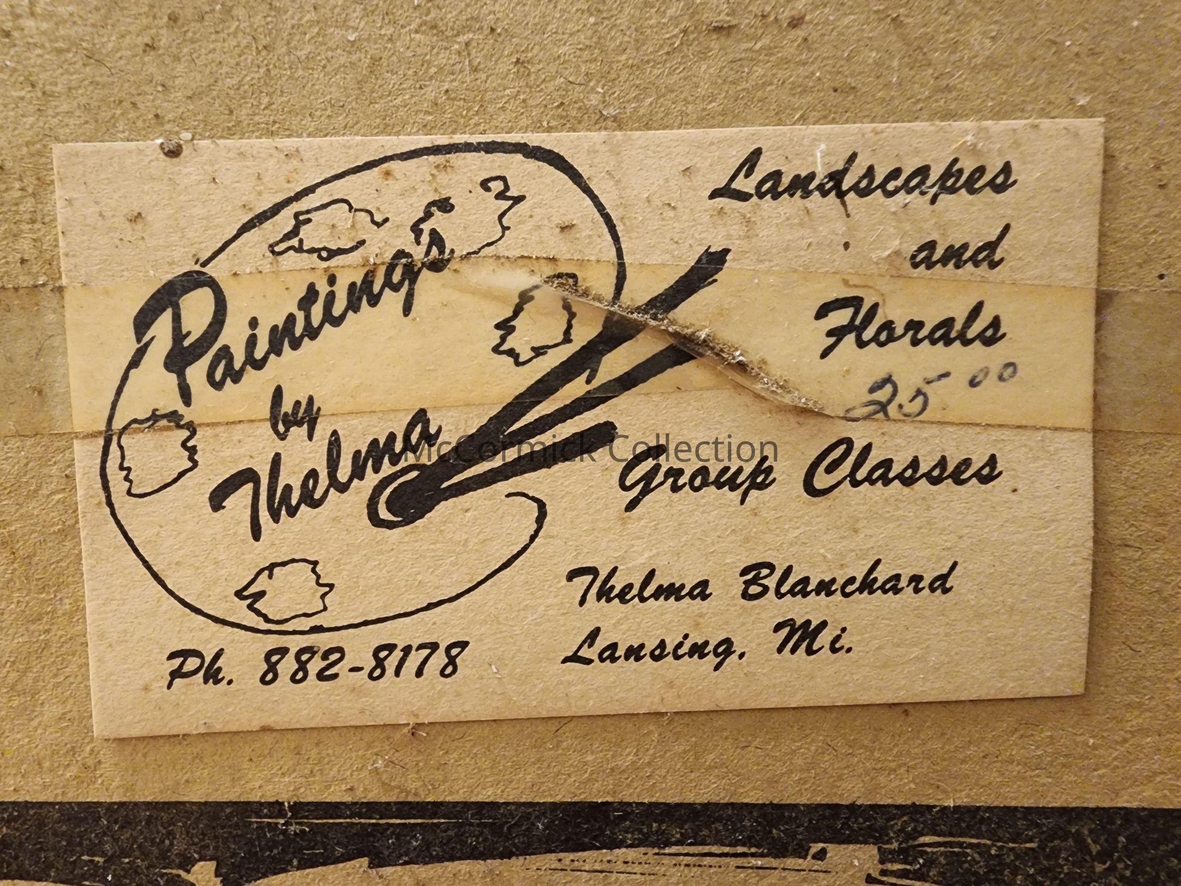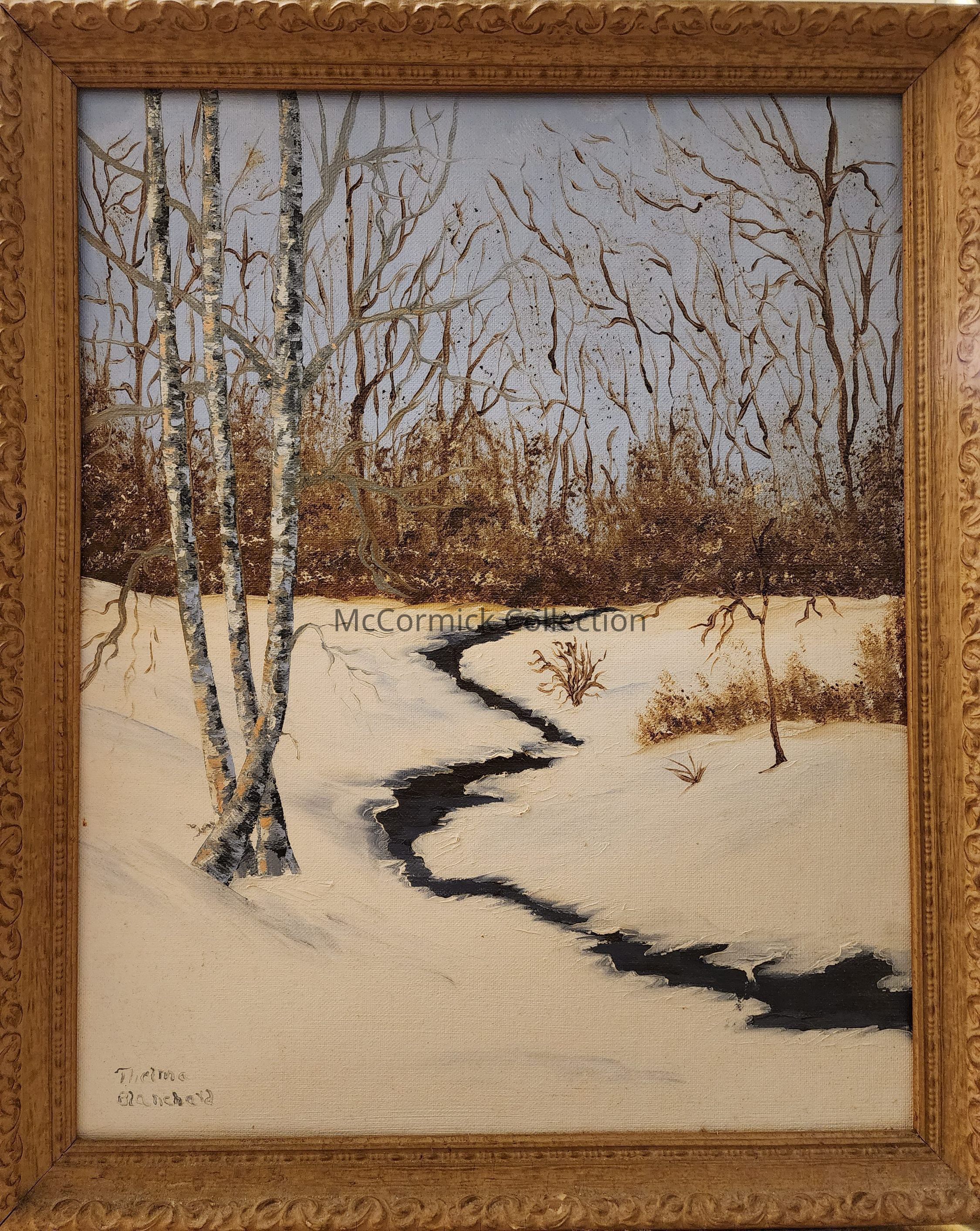 A framed painting of a winter scene by Thelma Blanchard of Lansing, Michigan.