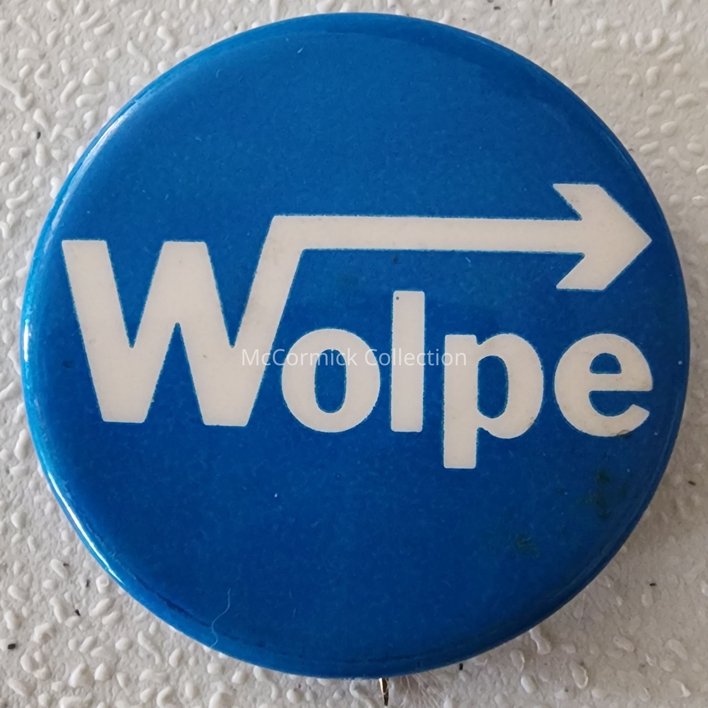 A 1.5" blue and white political button for Howard Wolpe for Congress, featuring his trademark arrow design.