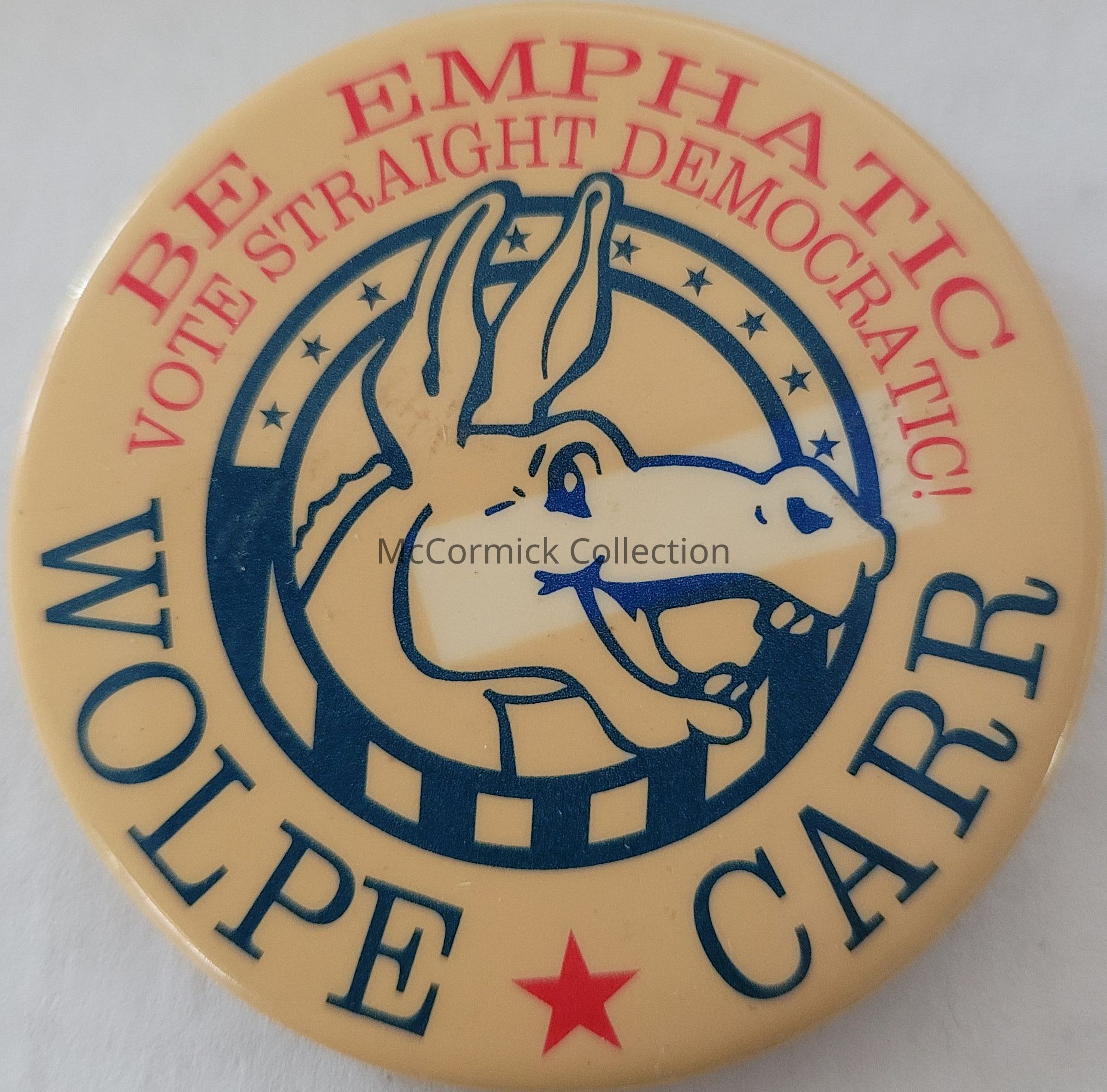 A 2.25" political button for Howard Wolpe for Governor and Bob Carr for United States Senator. "Be Emphatic Vote Straight Democratic!" with donkey slogan.
