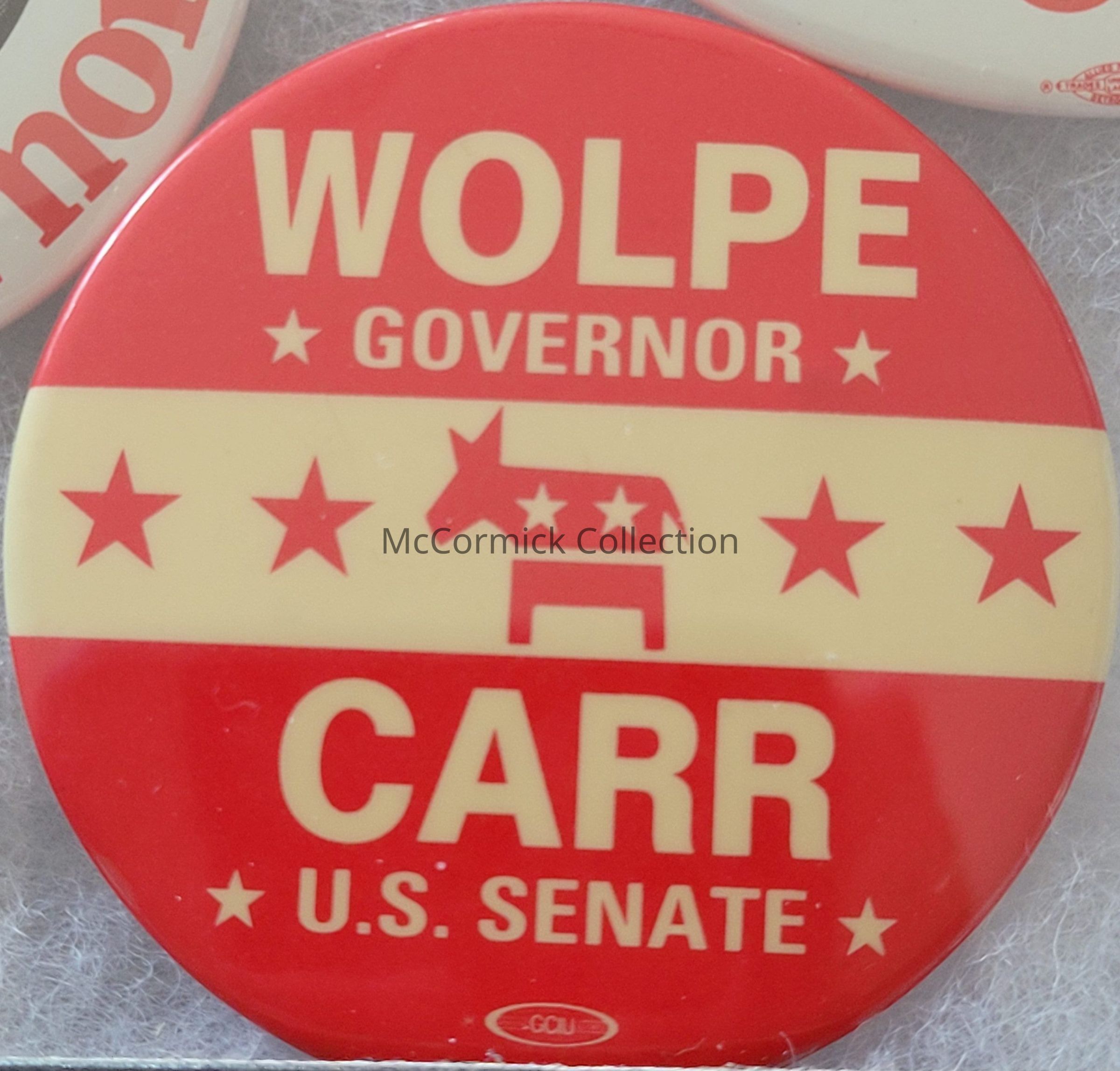 A 2.25" red and white political coattail button for Howard Wolpe for Governor and Bob Carr for U.S. Senate, 1994, with donkey symbol.