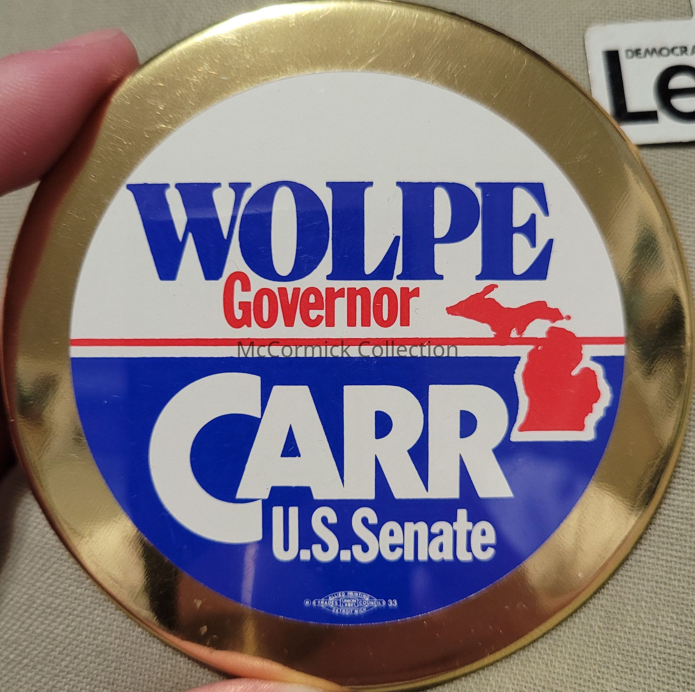 Large 3.5" political button for the 1994 campaigns of Howard Wolpe for Governor and Bob Carr for U.S. Senate.