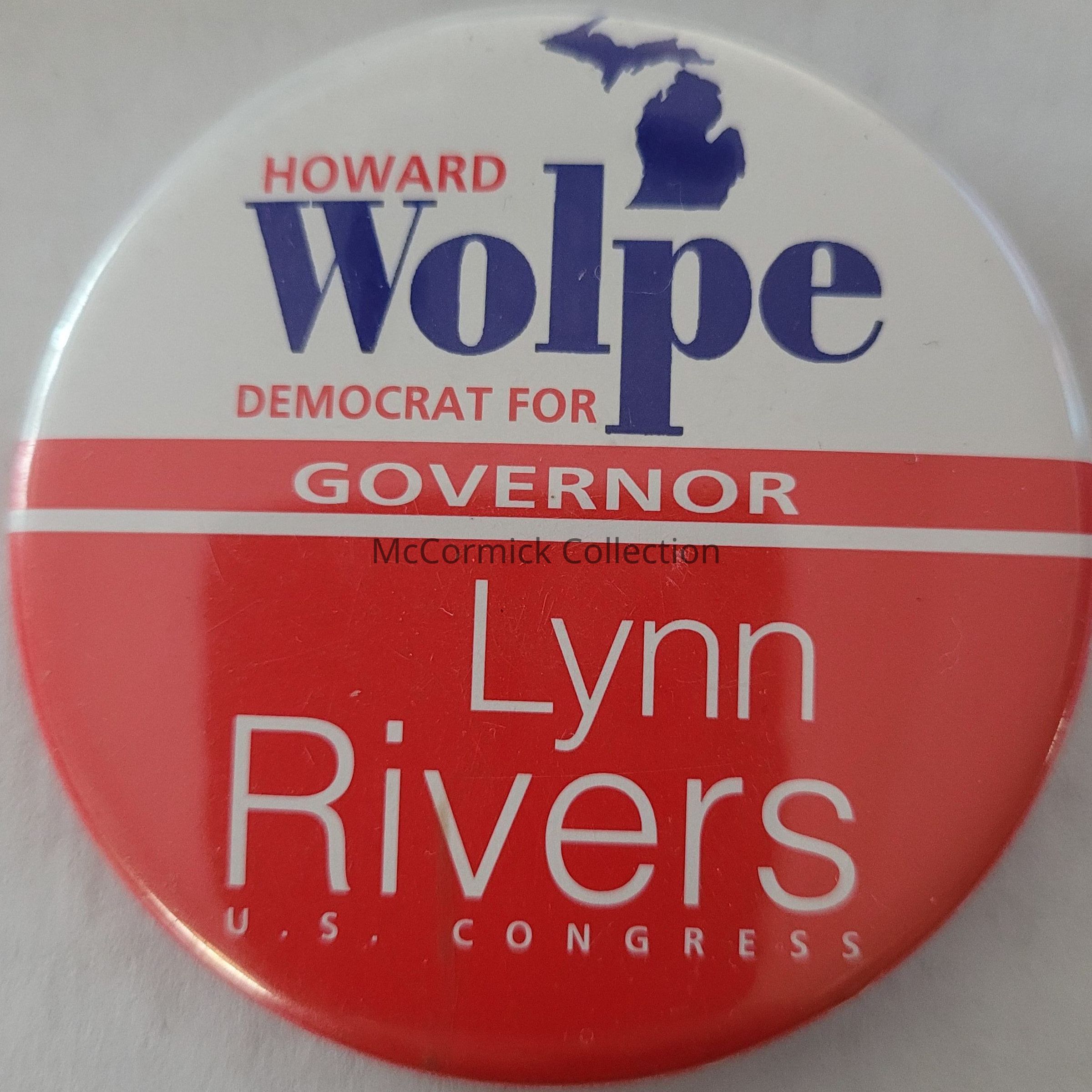 A 2.5" red, white, and blue political button for Howard Wolpe for Governor and Lynn Rivers for Congress, 1994.