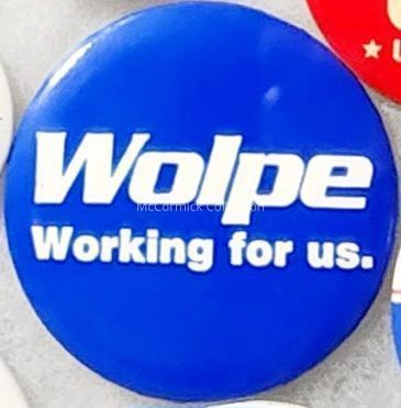A 2.25 blue and white political button for Howard Wolpe for Congress.