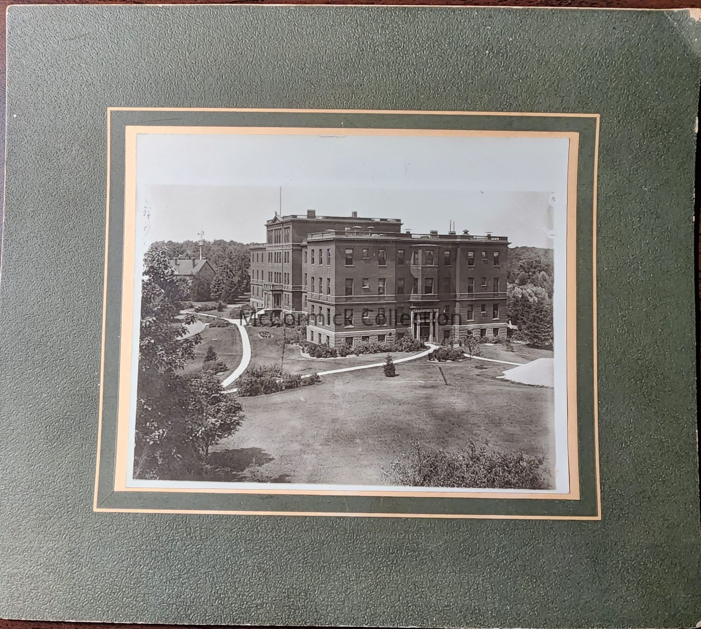 Card mounted photograph of the Women's Building (later Morrill Hall) at Michigan Agricultural College. Taken circa Fall 1904. Tied to Anna Openlander.