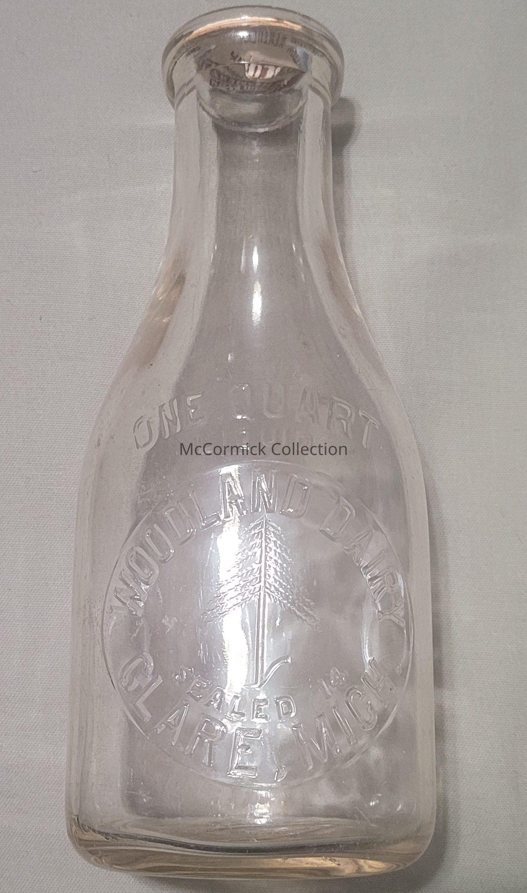 An embossed quart bottle from the Woodland Dairy of Clare, Michigan, operated by the Cornwell Ranch, with slug plate and tree symbol.