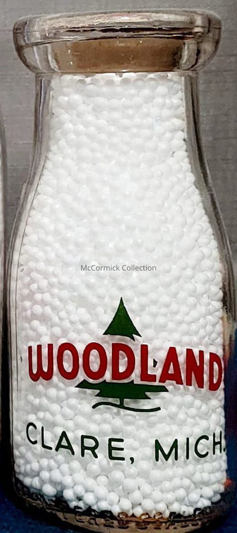 Woodland Dairy, Clare, Michigan, based on the Cornwell Ranch. Half pint bottle with green and red pyro.