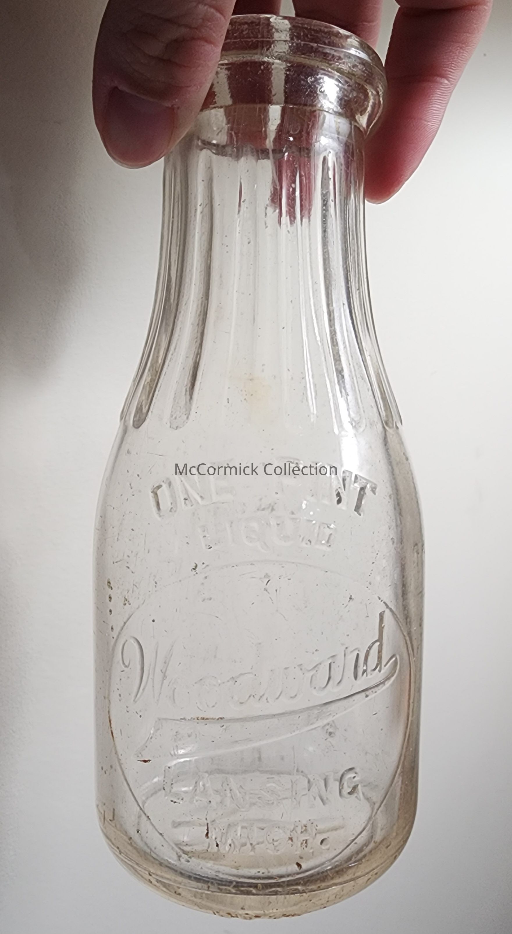 Pint bottle from the Woodward Sanitary Dairy of Lansing. Features a script logo on the slug plate and riged neck. In fine condition.