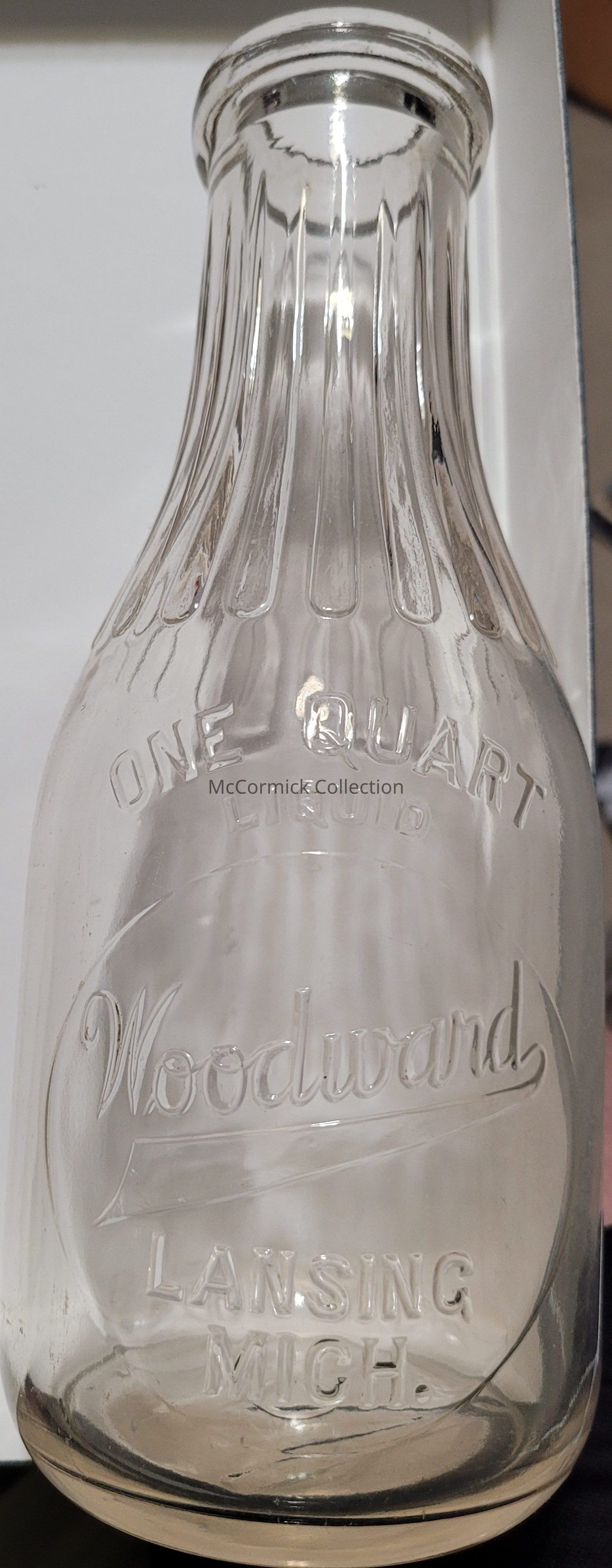 Embossed quart bottle with slug plate and ridged neck from the Woodward Sanitary Dairy of Lansing.