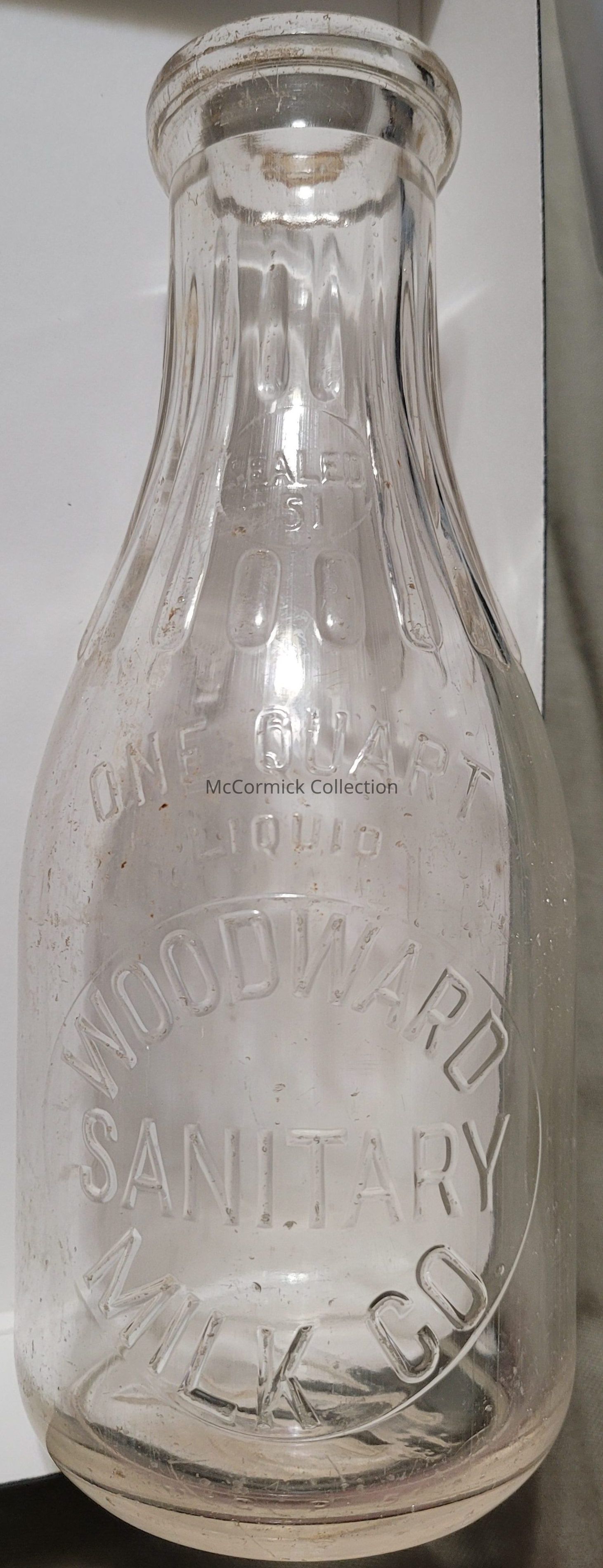An embossed round tall neck quart bottle with slug plate from the Woodward Sanitary Dairy Company of Lansing, Michigan.