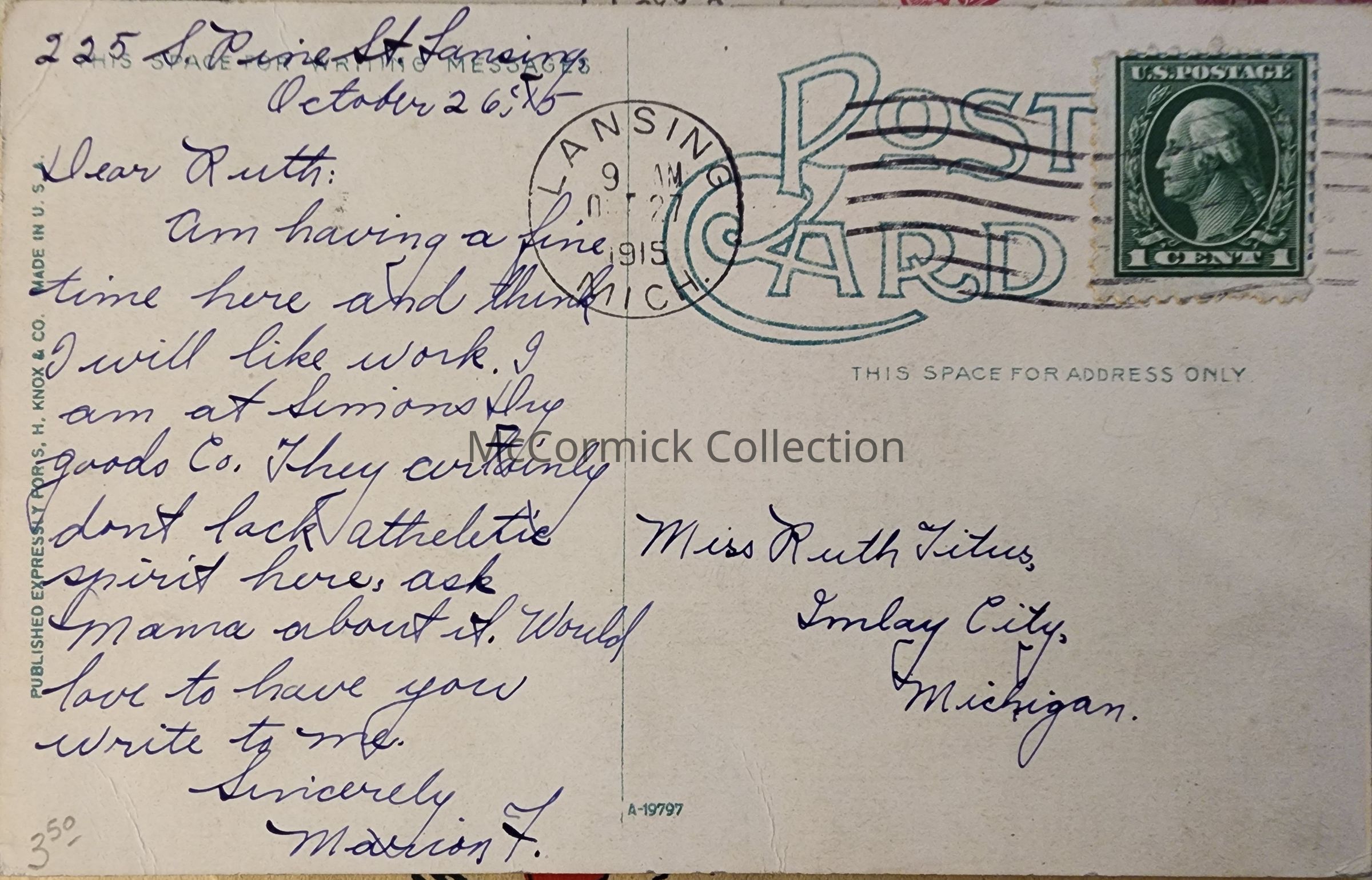 Postmarked Lansing 1915.