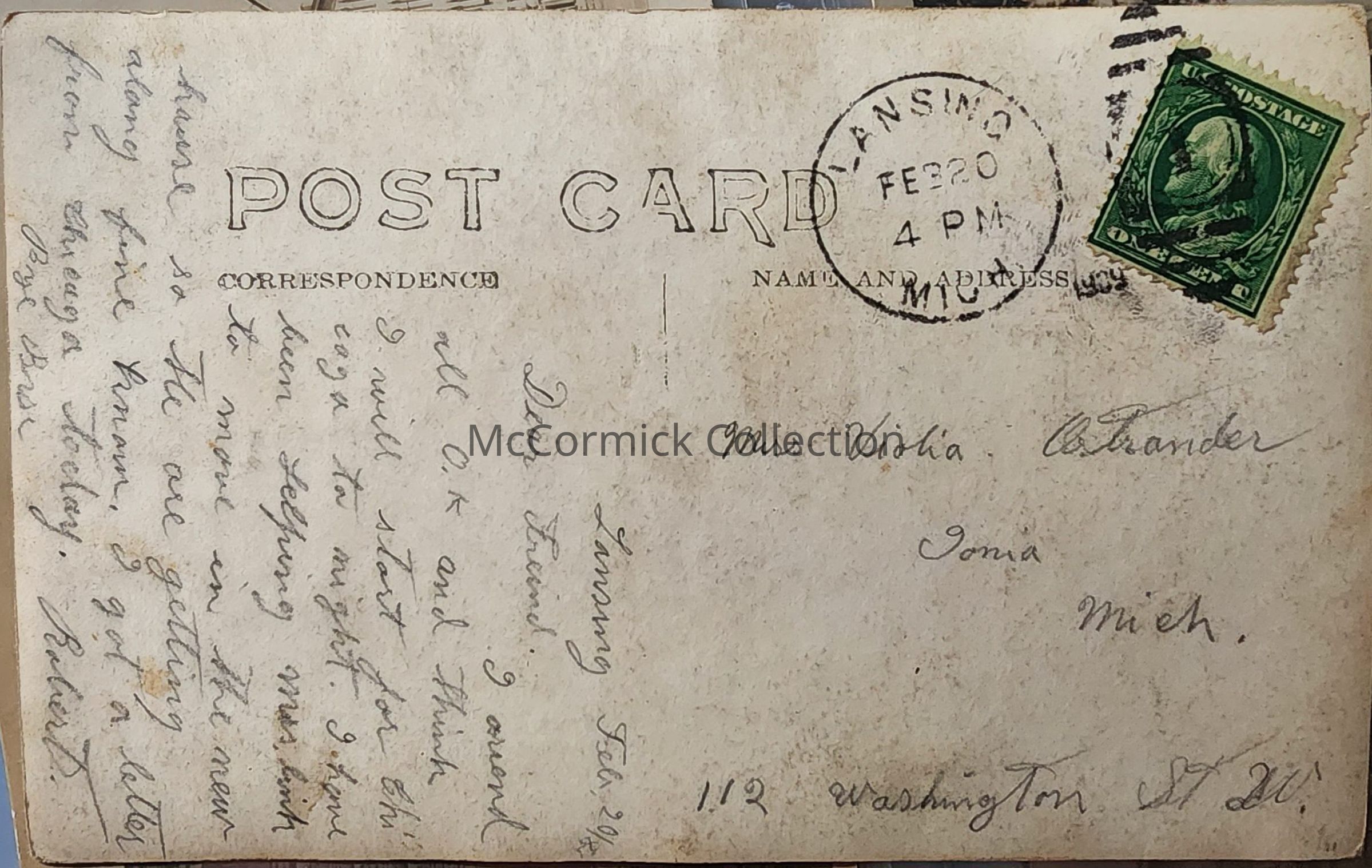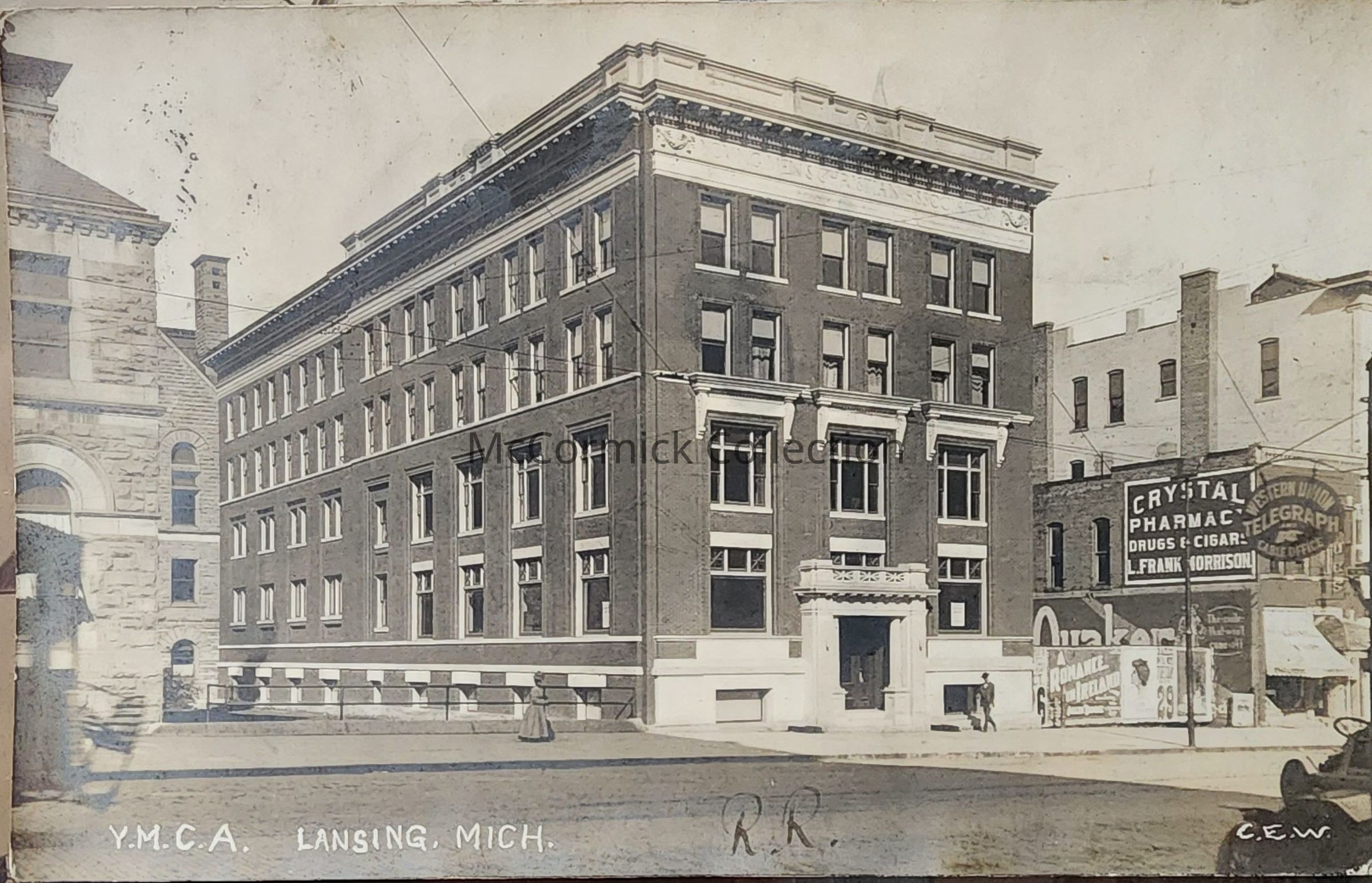 Real photo postcard of the Lansing YMCA on Michigan Avenue. By East Lansing photographer Charles E. Walter, C.E.W. Also shows Crystal Pharmacy and edge of Post Office. Postally used, Lansing postmark, circa 1908.Made/Created
