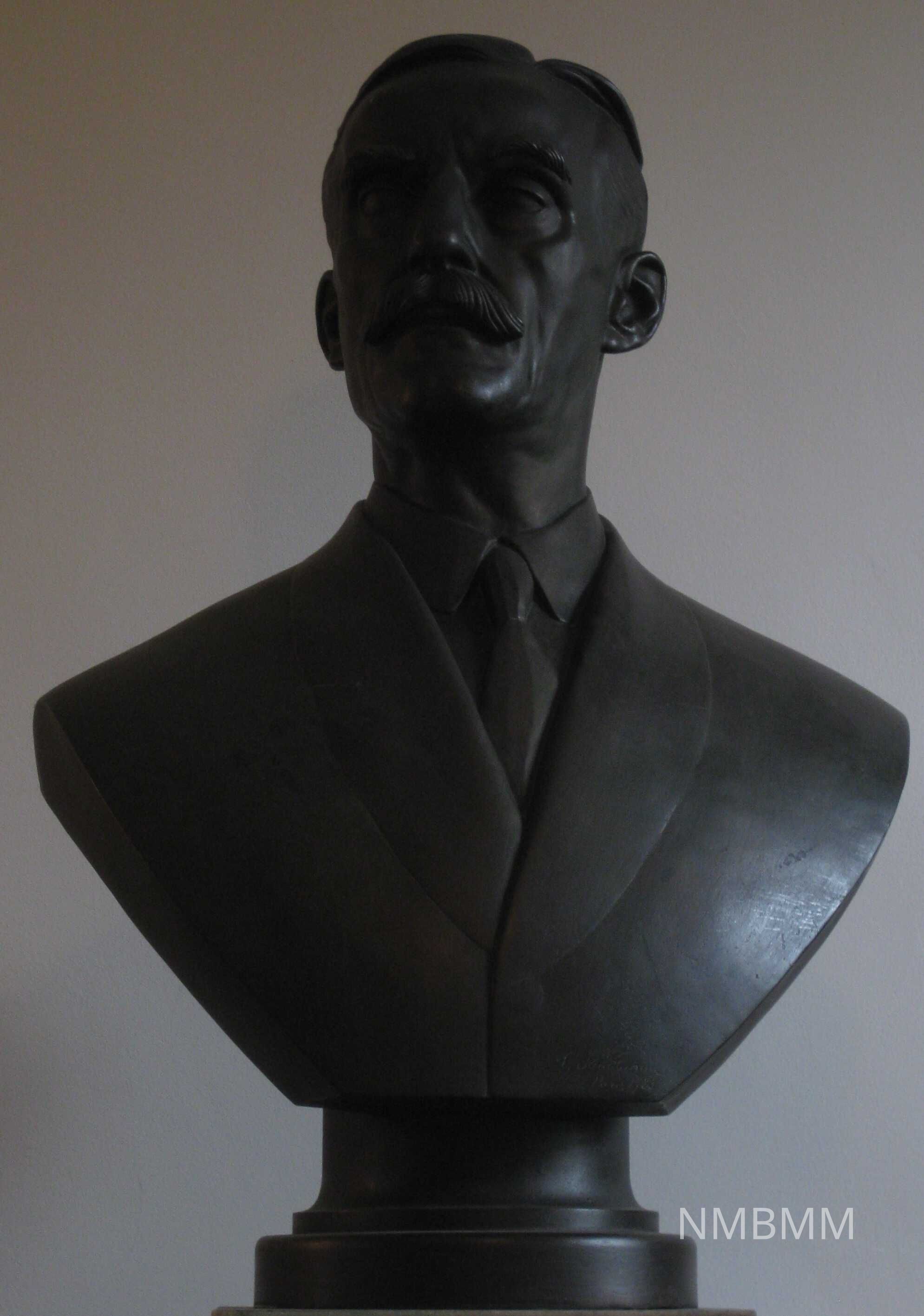 BRONZE BUST OF ANDREW MELLON, 37" HIGH. MARBLE PEDESTAL, 60" HIGH WITH BIOGRAPHICAL INFORMATION ON PEDESTAL " ANDREW WILLIAM MELLON; BORN MARCH 24, 1855; FINANCIER; STATEMAN".