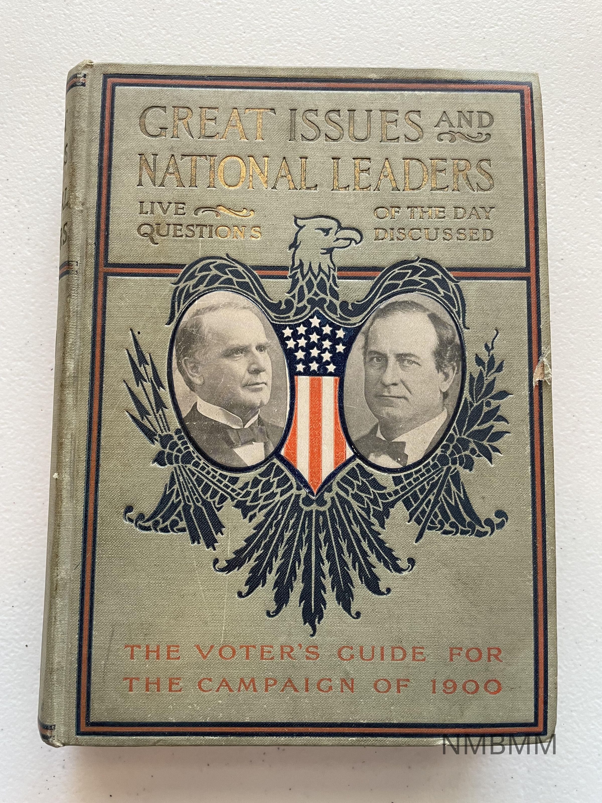 The book is titled "Great Issues and National Leaders: Live Questions of the Day Discussed: The Voter's Guide to the Campaign of 1900".