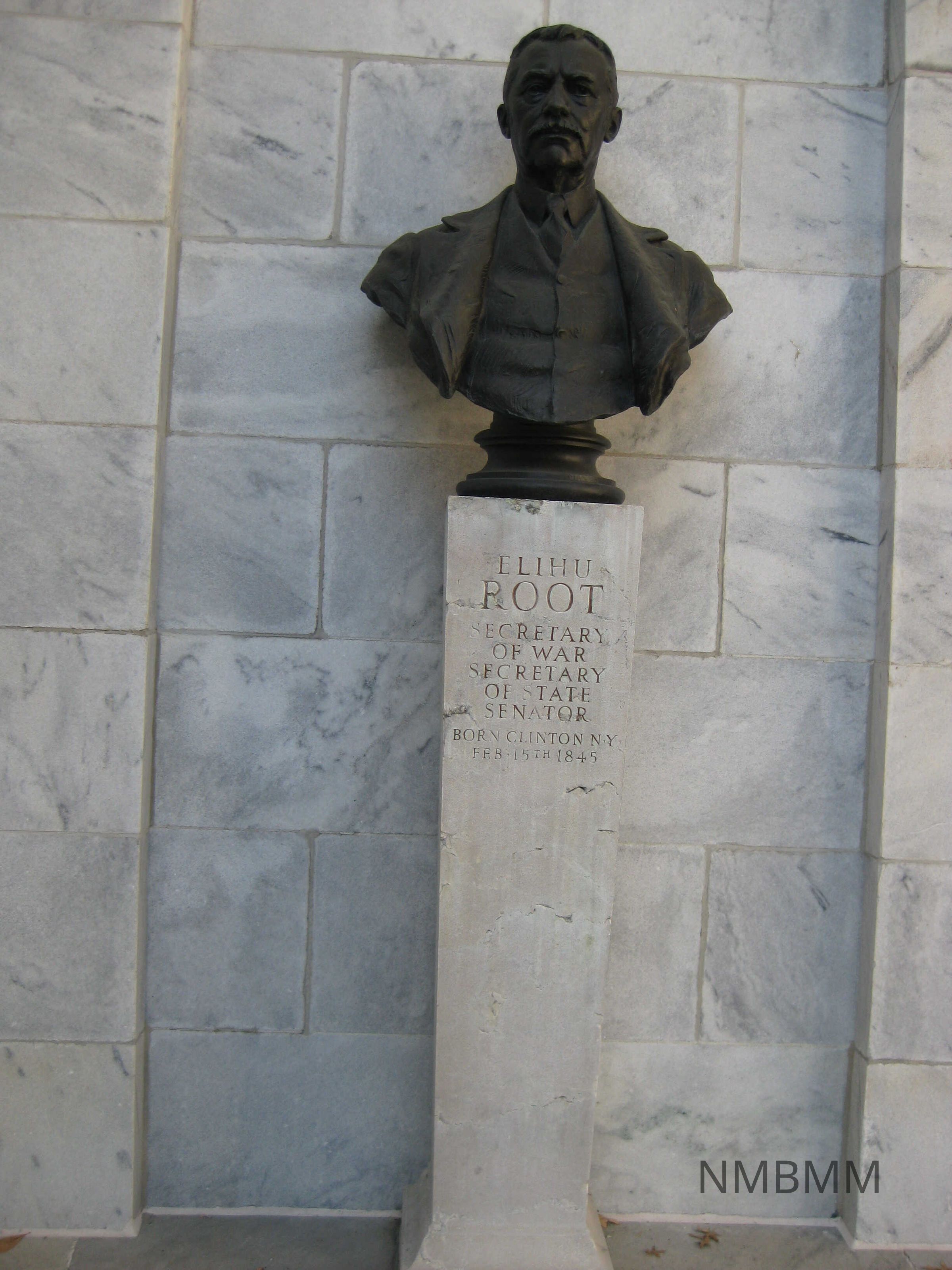 BRONZE BUST OF ELIHU ROOT, 37" HIGH. MARBLE PEDESTAL, 60" HIGH WITH BIOGRAPHICAL INFORMATION ON PEDESTAL "ELIHU ROOT; SECRETARY OF WAR; SECRETARY OF WAR; SECRETARY OF STATE; SENATOR; BORN CLINTON NY; FEB 15TH 1845