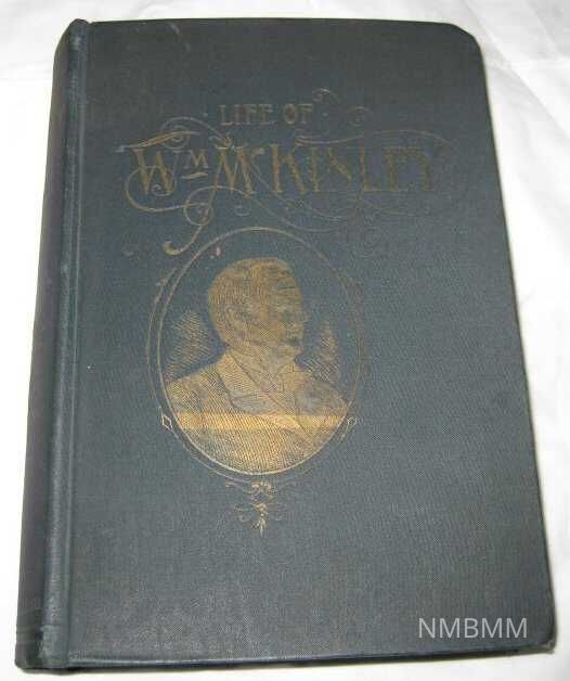 The book is titled "Life of William McKinley." The book is a biography of William McKinley. The book is bluish green and features gold lettering. It also features an etching of President McKinley on the cover. Inside the front cover has the name "Alfred D. Pearce, Niles, Ohio" written in script.