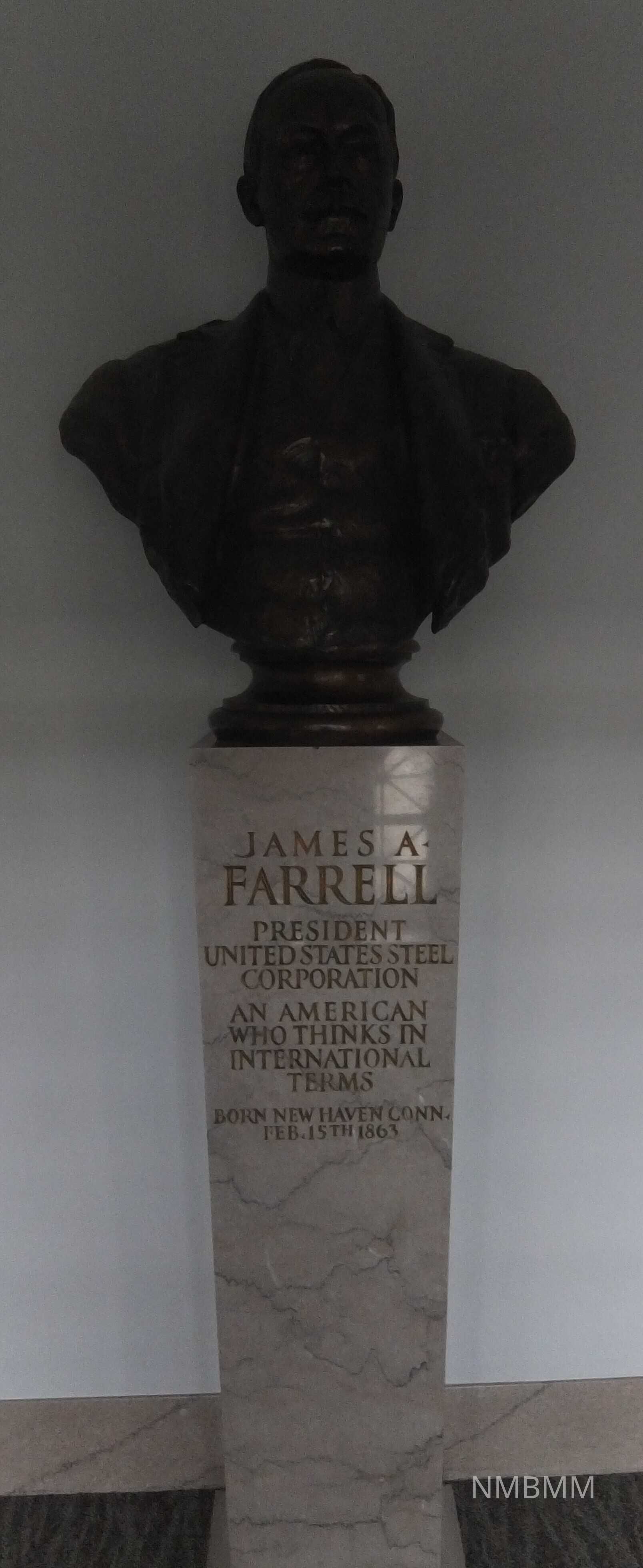 BRONZE BUST OF JAMES FARRELL, 37" HIGH. MARBLE PEDESTAL, 60" HIGH WITH BIOGRAPHICAL INFORMATION ON PEDESTAL "JAMES A. FARRELL; PRESIDENT UNITED STATES STEEL CORPORATION; AN AMERICAN WHO THINKS IN INTERNATIONAL TERMS; BORN NEW HAVEN CONN. FEB. 15TH 1863"Collection