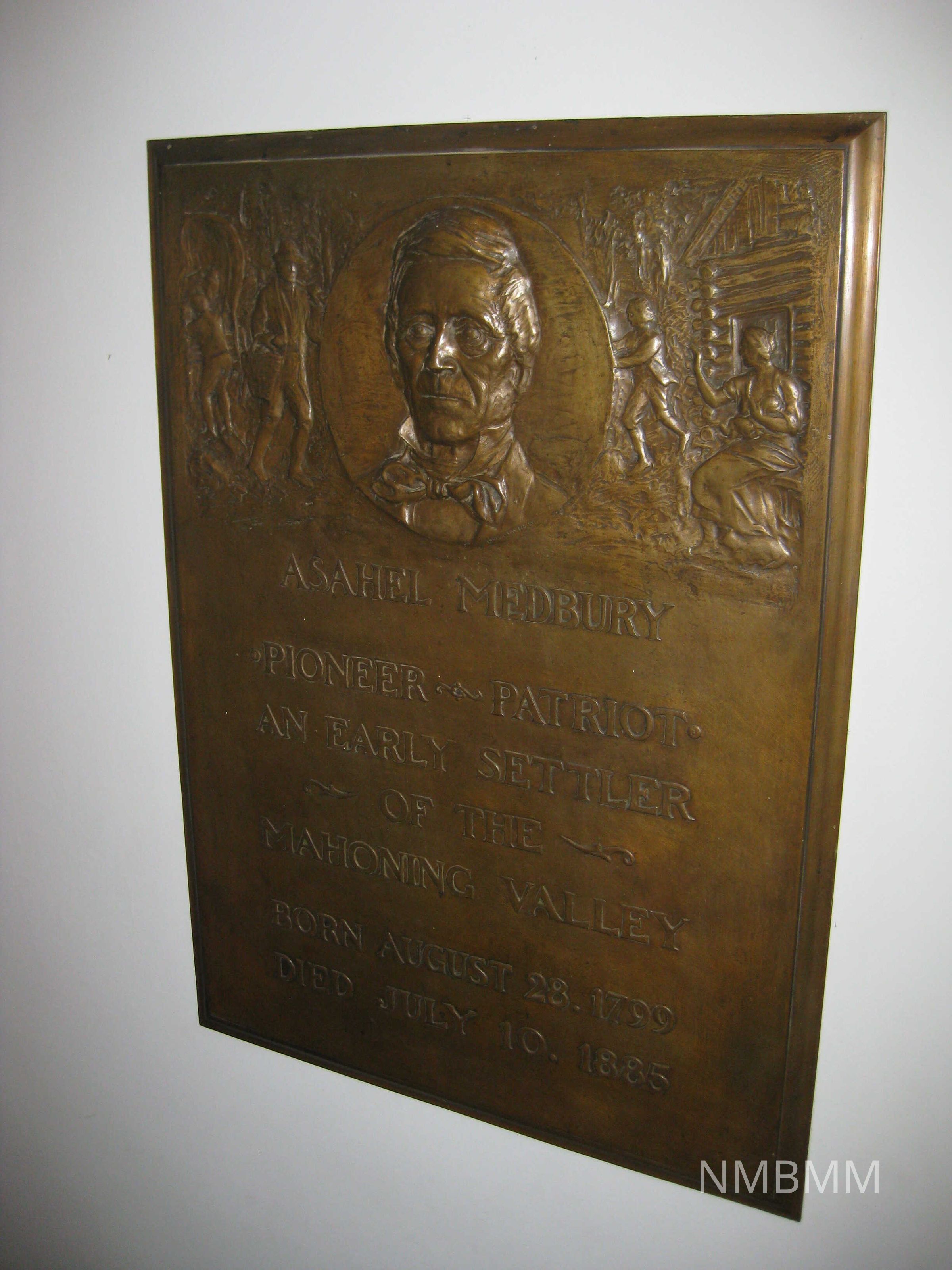 BRONZE PLAQUE OF ASHAEL MEDBURY. 33" X 24" "ASAHEL MEDBURY; PIONEER; PATRIOT; AND EARLY SETTLER OF THE MAHONING VALLEY; BORN AUGUST 28, 1799; DIES JULY 10, 1855"