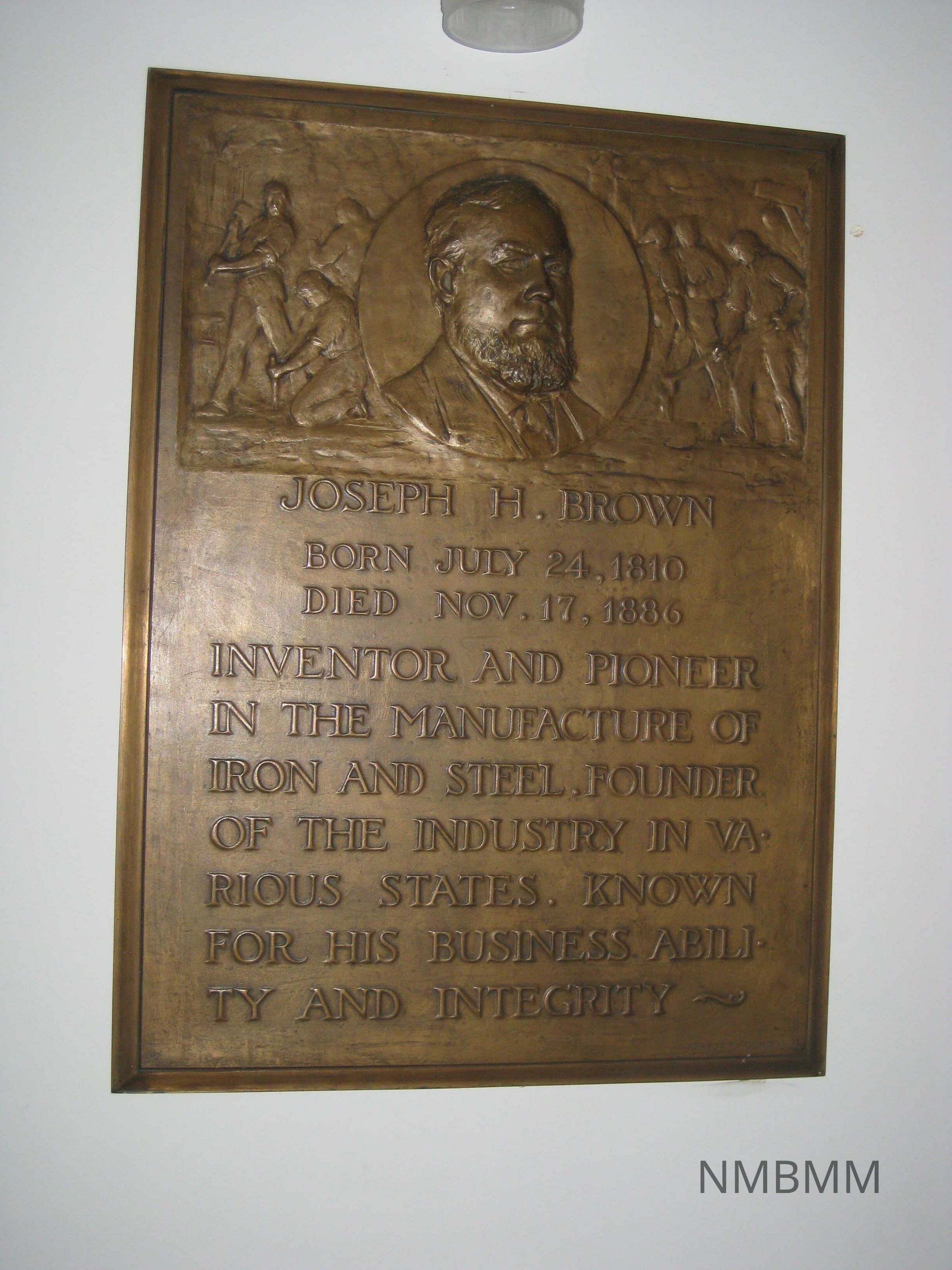 BRONZE PLAQUE OF JOSEPH H. BROWN. 33" X 24" "JOSEPH H. BROWN; BORN JULY 24, 1810; DIED NOV. 17, 1886; INVENTOR AND PIONEER IN THE MANUFACTURE OF IRON AND STEEL, FOUNDER OF THE INDUSTRY IN VARIOUS STATES, KNOWN FOR HIS BUSINESS ABILITY AND INTEGRITY"