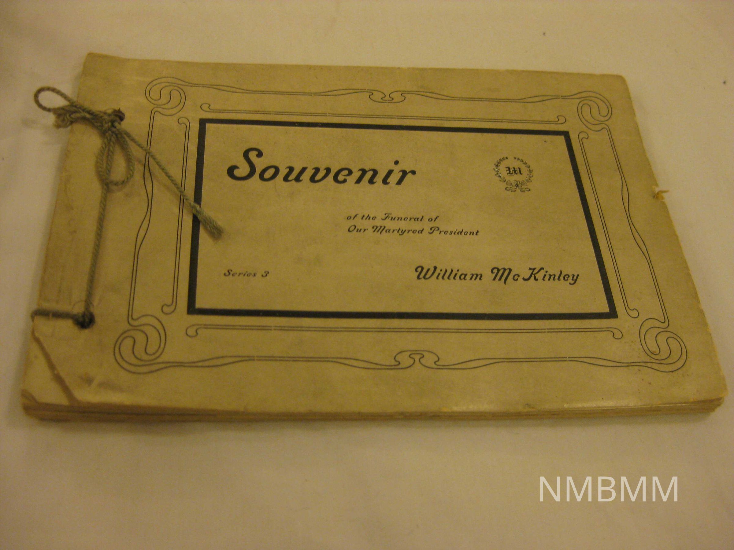 The book is titled "Souvenir of the Funeral of Our Martyred President William McKinley," and is a photographic album of his funeral. It is white with black lettering and designs and a "W" on the cover surrounded with olive branches. It is bound with green string. It was published in 1901 by The Enterprise Printing Company in Canton, Ohio.