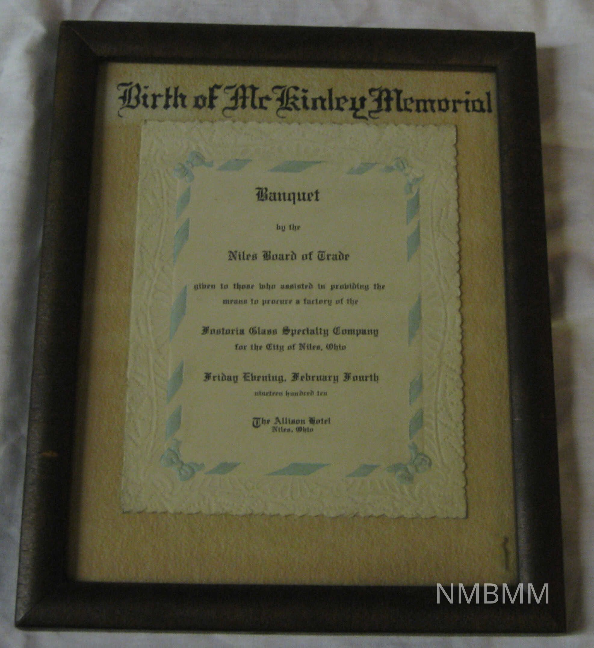 PROGRAM FROM 1910 BANQUET OF NILES BOARD OF TRADE. FEBRUARY 4, 1910. "BIRTH OF MCKINLEY MEMORIAL" WOOD FRAME. 8" X 7"