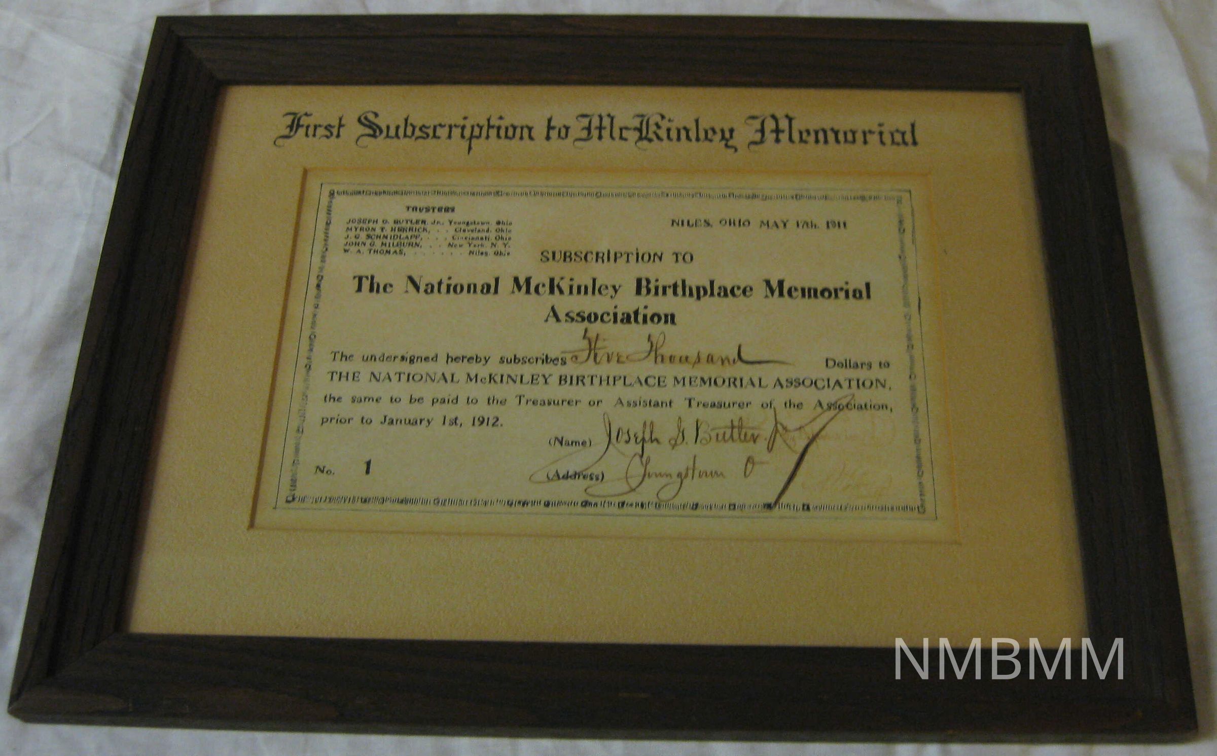 FIRST SUBSCRIPTION TO MEMORIAL BY J.G. BUTLER. MAY 17, 1911. WOOD FRAME. 10" X 13"Collection