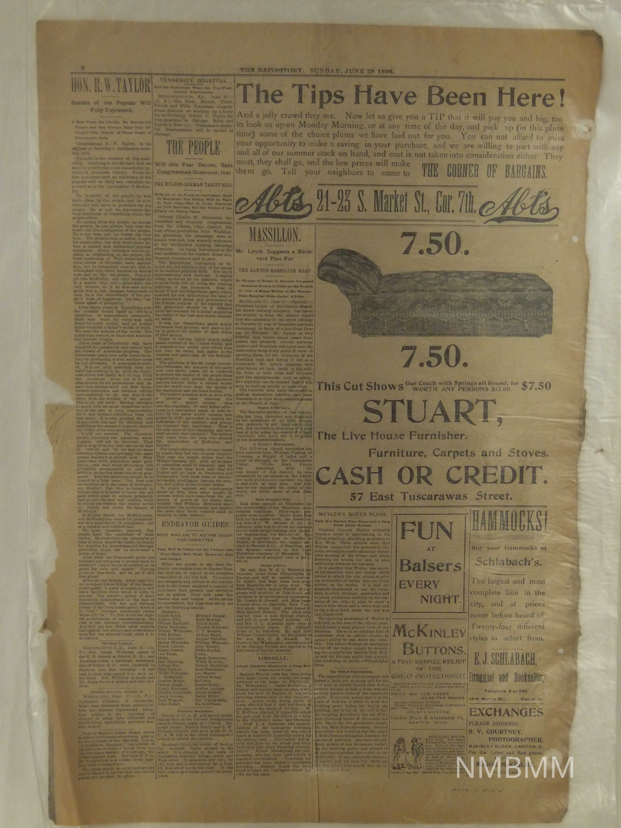 06/28/1896 Canton Sunday Repository. Headline reads "Still Has Hope." Articles about 1896 Presidential Election Campaign of Governor William McKinley and his speech at the Ratification Meeting.Collection