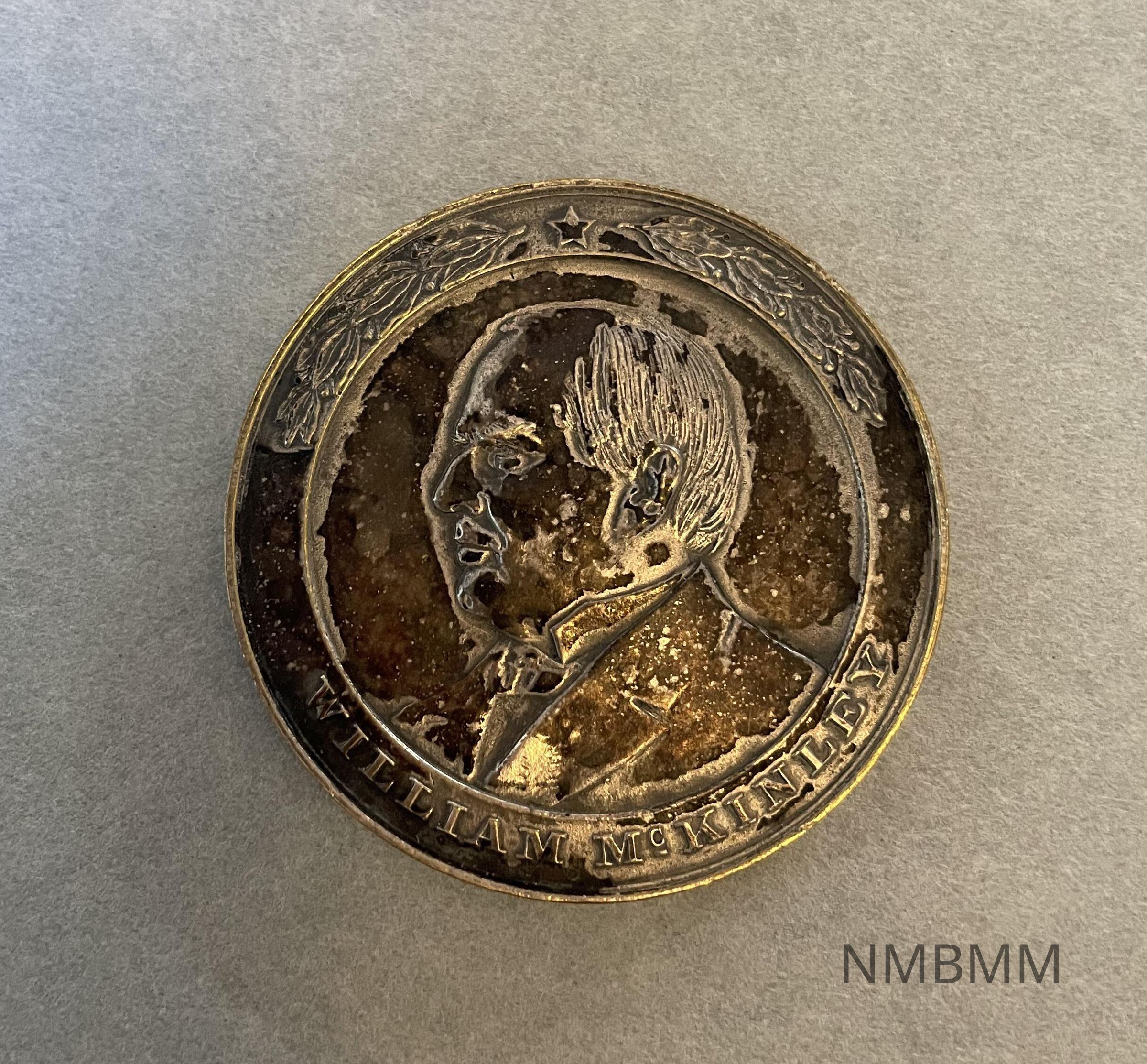 Silver coin with an engravong of a head and "William McKinley" on the front. The Canton Memorial and "Dedicated Canton Ohio Sept.30.1907 McKinley Memorial" on the back.Acquisition