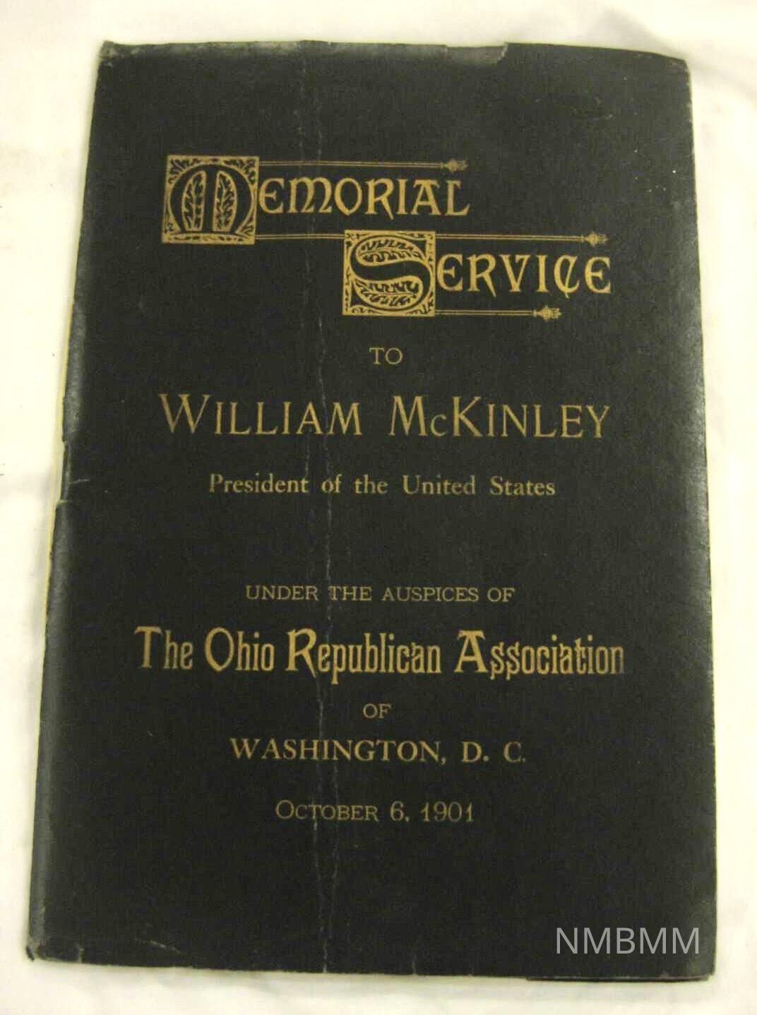 The book is titled "Memorial Service to William McKinley: Late President of the United States Under the Auspices of the Ohio Republican Association of Washington, D.C.." The book was requested and printed by T.M. Sullivan.The service was held on October 6, 1901 at the Chase's Theater. Contains text of memorial addresses, photographs of individuals who gave addresses, and hymns.Collection