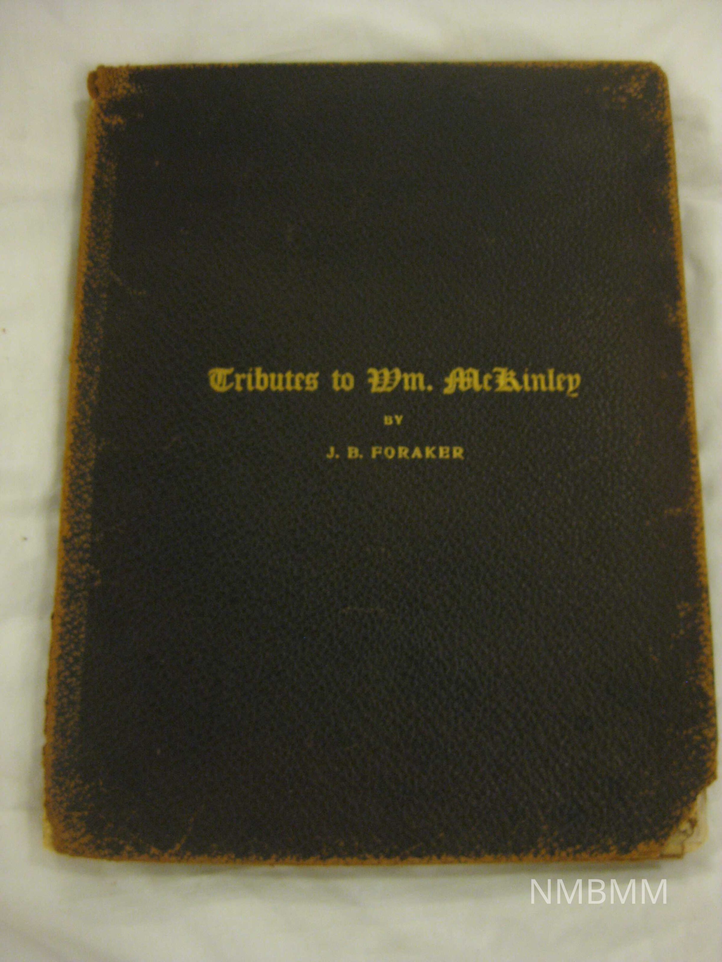 The book is titled "Tributes to Wm. McKinley." The book features newspaper reports of speeches, and a memorial address delivered at Music Hall, Cincinnati, Ohio the day of the President's funeral.