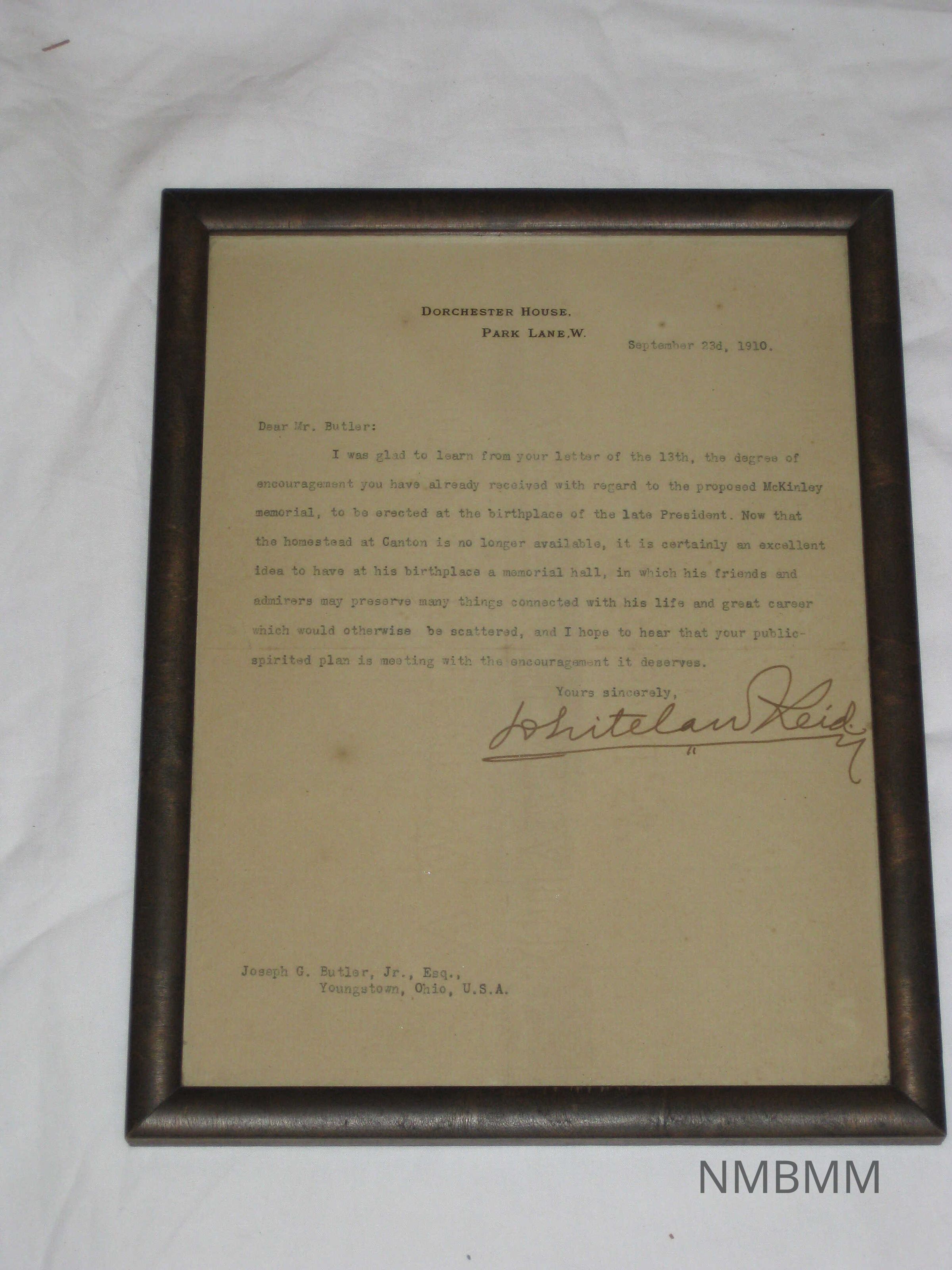 Letter from Whitelaw Reid to J.G. Butler commending him for the memorialCollection