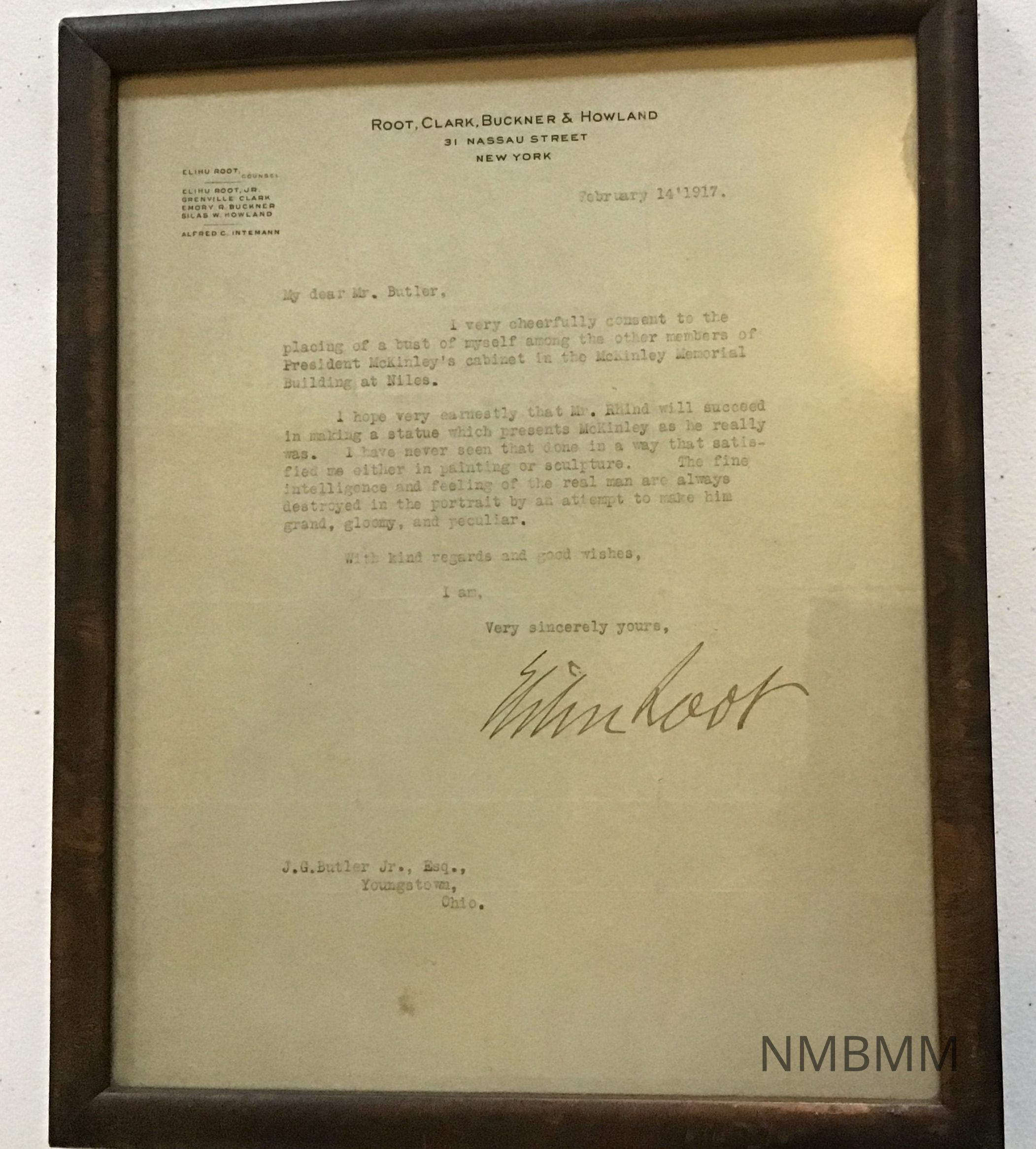 Typed letter from Elihu Root to J.G Butler regarding Root's bust for the memorial. Text of letter is as follows: