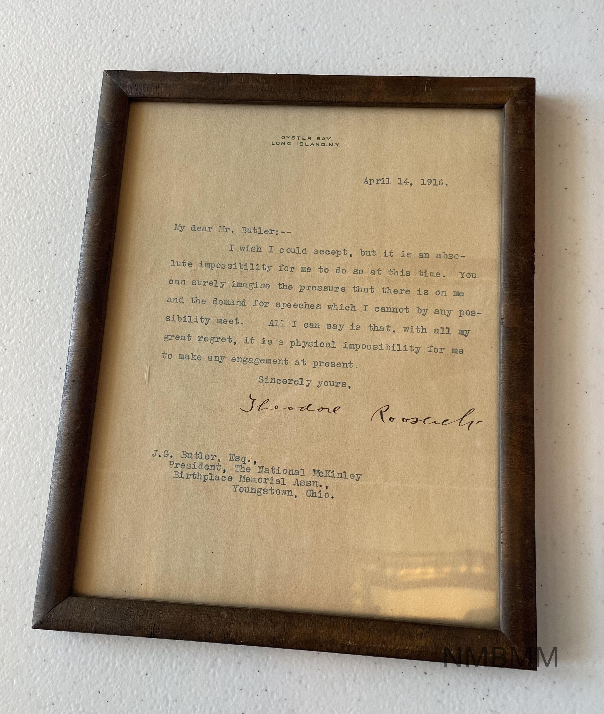 Letter from Theodore Roosevelt to J.G. Butler expressing regrets at not being able to attend the memorial dedication.Collection