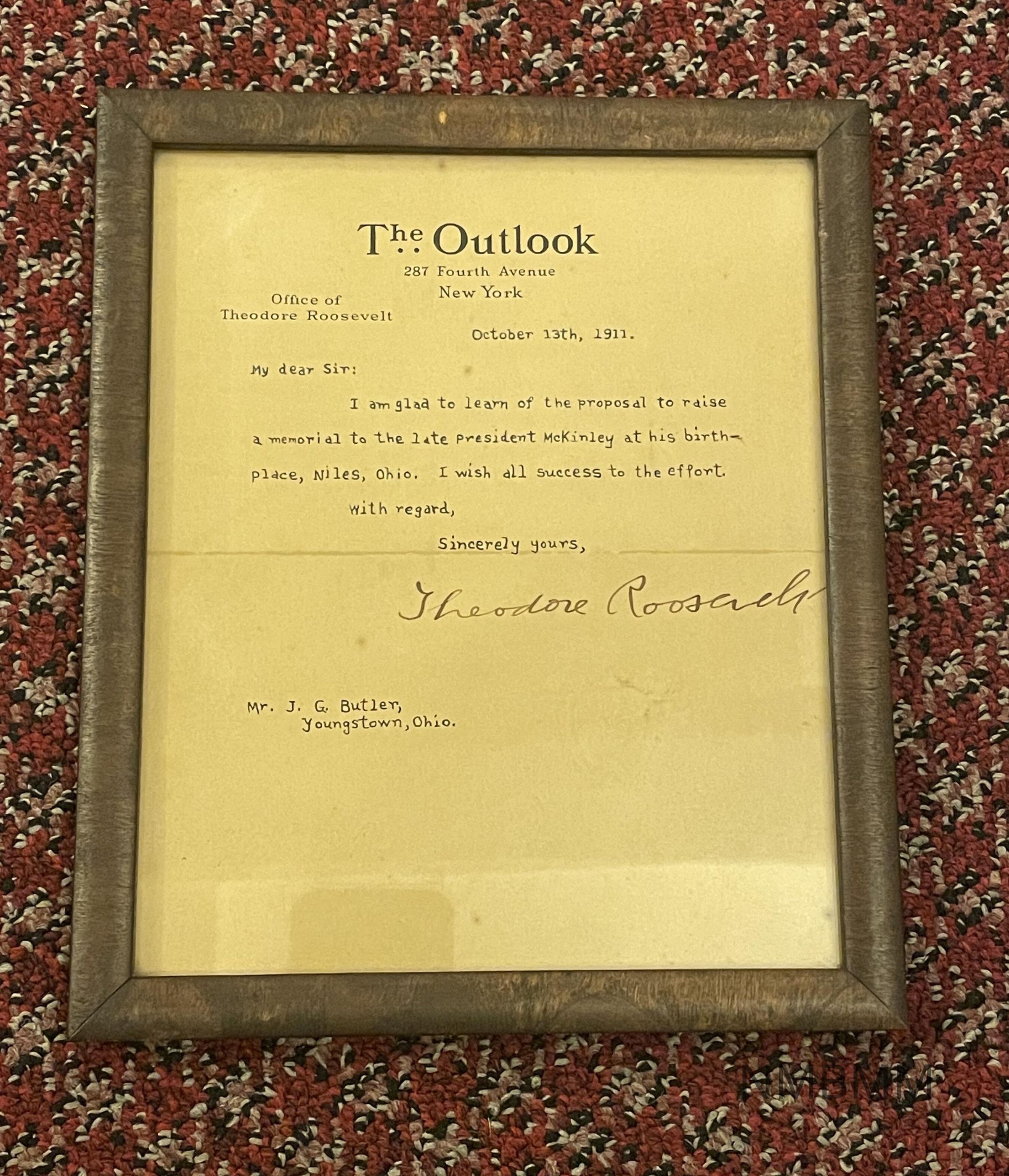 Letter from Theodore Roosevelt to J.G. Butler wishing him success with the Memorial, 1911.Collection