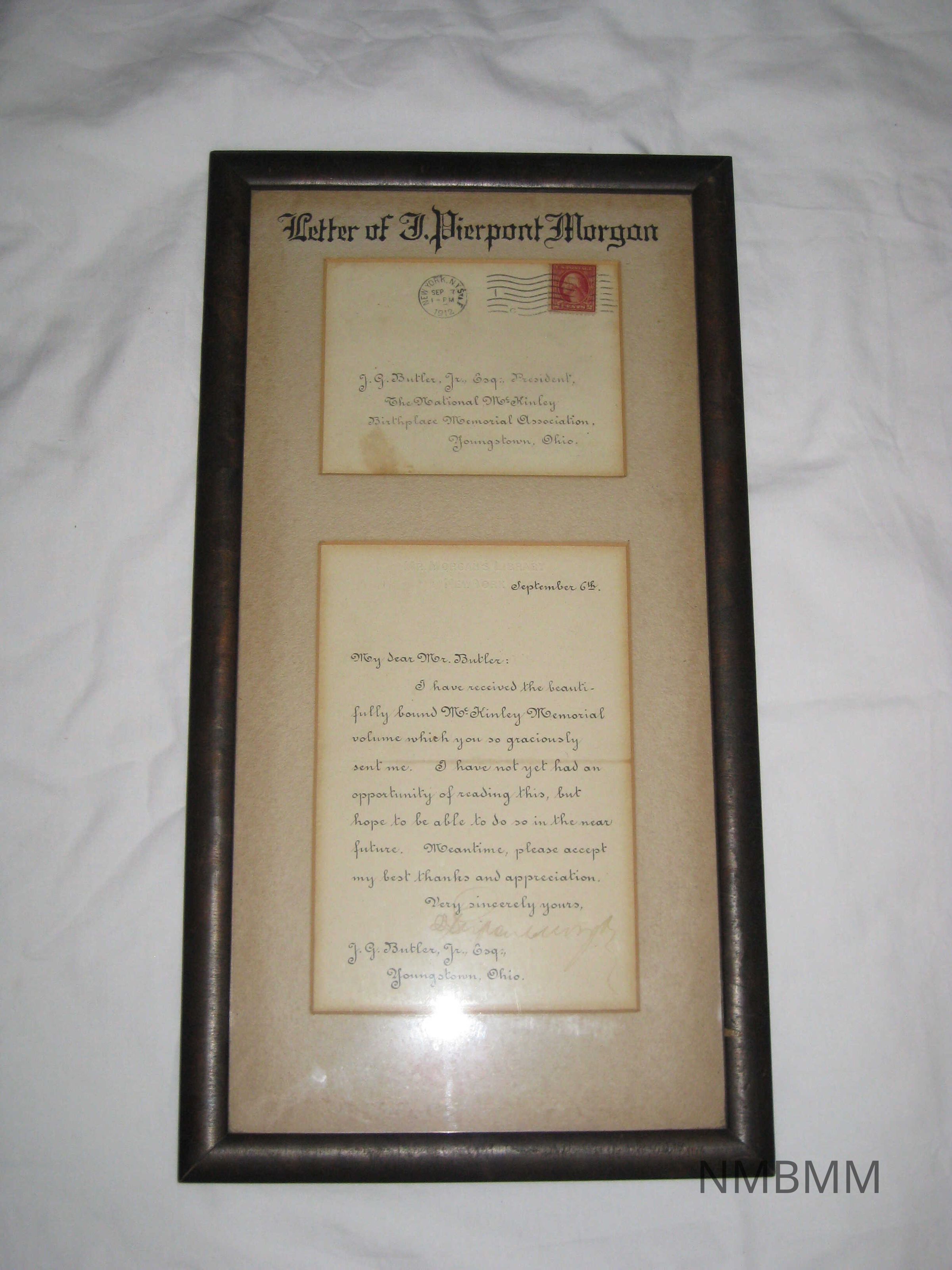 Letter from J. Pierpont Morgan to J.G. Butler thanking him for the McKinley Memorial book. Envelope included.Collection