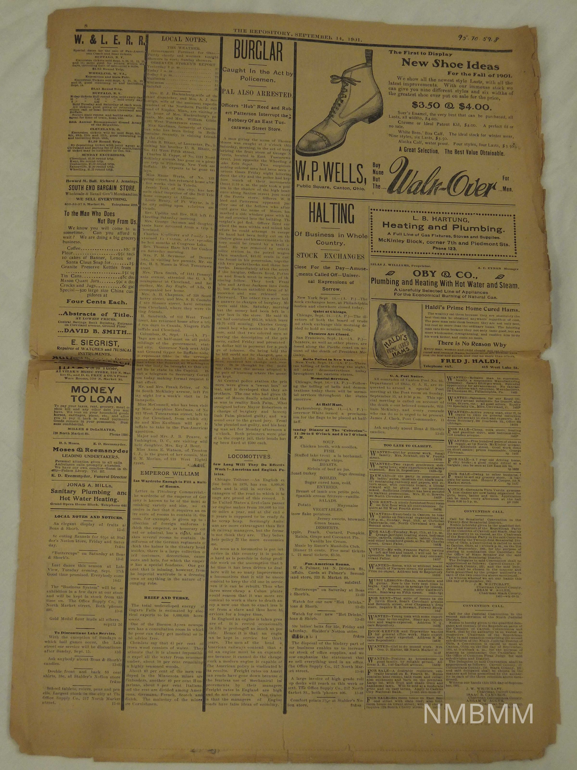 09/14/1901 Canton Evening Repository. Headline reads "The Whole World Mourns." Articles about the death and funeral of President William McKinley, swearing in of Theodore Roosevelt.Collection